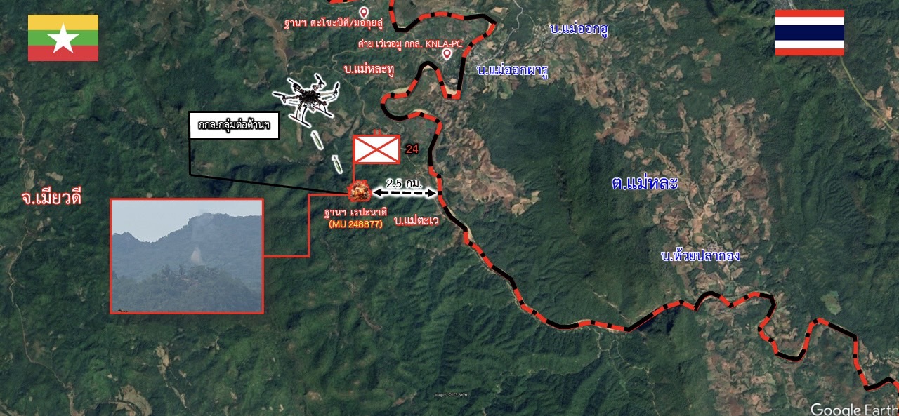 เมื่อวันที่ 7 พ.ค. 68 รายงานข่าวจากกองกำลังราชมนู เปิดเผยว่า ช่วงเช้าวันนี้ กองทัพปลดปล่อยชาติกะเหรี่ยง (กกล.KNLA) ร่วมกับ องค์การป้องกันชาติกะเหรี่ยง(กกล.KNDO) ได้นำกำลังเข้าประชิดปิดล้อม และใช้อากาศยานไร้คนขับ โดรนโจมตีทิ้งระเบิด อย่างต่อเนื่องตลอดทั้งวัน ต่อที่ตั้งทหารเมียนมา ฐานเรปะนาดิ ( พัน.ร.24 ) อ.แลงปอย จ.ผาอัน รัฐกะเหรี่ยง สมม. ด้านตรงข้าม บ.แม่ออกผารู ม.3 ต.แม่หละ อ.ท่าสองยาง จ.ตาก ห่างจากแนวชายแดนประมาณ 2.5 กิโลเมตร