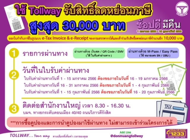 ใช้ "Tollway" รับสิทธิ์ลดหย่อนภาษี สูงสุด 30,000 บาท ในโครงการ "ช๊อปดี มีคืน" 1 มกราคม - 15 กุมภาพันธ์ 2566 สามารถดำเนินการได้โดย