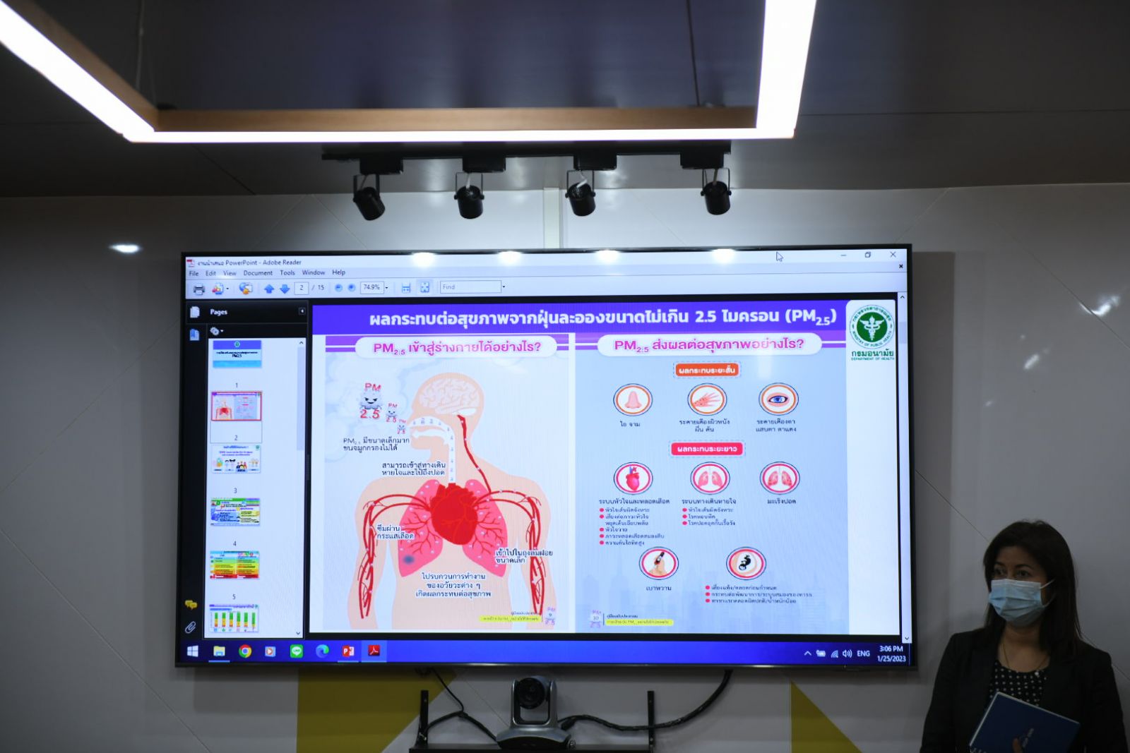 นายแพทย์เอกชัย เพียรศรีวัชรา รองอธิบดีกรมอนามัย ได้กล่าวถึงผลสำรวจจากกระทรวงสาธารณสุขในช่วง 3 สัปดาห์ที่ผ่านมาพบว่า ผู้ที่เจ็บป่วยจากโรคระบบทางเดินหายใจ โรคผิวหนัง และโรคตาอักเสบ เพิ่มขึ้นจากช่วงเดือนธันวาคม 65 โดยผู้ที่เจ็บป่วยจากผลกระทบทางด้านอากาศประมาณ 110,000 คนทั่วประเทศ ซึ่งปัจจุบันช่วง 3 สัปดาห์ที่ผ่านมานี้ (เดือนมกราคม 66) มีจำนวนเพิ่มขึ้นอีกประมาณ 90,000 คนทั่วประเทศ ทางกระทรวงสาธารณสุขจึงมีความเป็นห่วงประชาชน เนื่องจากการสำรวจการป้องกันตัวเองผ่าน 4Health_PM2.5 พบว่า ร้อยละ 60 เป็นผู้สูงอายุ ผู้ที่มีโรคประจำตัว รวมถึงเด็กเล็ก ซึ่งกลุ่มเหล่านี้จะมีอาการน้อย เช่น เจ็บตา ตาแดง คันคอ น้ำมูกไหล ในส่วนของผู้ที่มีอาการรุนแรงมักมีอาการ เช่น หายใจลำบาก เหนื่อย แน่นหน้าอก แต่ยังไม่พบมากนัก อย่างไรก็ตามทางกระทรวงสาธารณสุขได้มีการให้คำแนะนำกับพี่น้องประชาชนมาตลอดว่า ค่าฝุ่นระดับไหน ควรดูแลตัวเองอย่างไร รวมถึงขอความร่วมมือผู้ที่มีความเสี่ยงสูง หากอยู่ในพื้นที่สีส้มหรือสีแดงควรอยู่ที่บ้านจะปลอดภัยกว่า ส่วนผู้ที่จำเป็นต้องทำงาน ก็อยากให้ work from home เพื่อความปลอดภัยเช่นกัน และควรใส่หน้ากากอนามัย N95 หรือหน้ากากอนามัยซ้อน 2 ชั้น นอกจากนี้ผู้ที่มีโรคประจำตัวควรเตรียมรักษาประจำตัวไว้อยู่เสมอ หากพบว่ามีอาการรุนแรงเพิ่มขึ้นสามารถไปปรึกษาแพทย์ ซึ่งกระทรวงสาธารณสุขมีสายด่วน 1478 หรือ แอปพลิเคชันของกระทรวงสาธารณสุขอย่าง 4Health_PM2.5 สามารถเข้ามาประเมินระดับความรุนแรงของอาการจากฝุ่น PM2.5 ก่อนได้ ซึ่งจะให้คำแนะนำในการปฏิบัติตนตามระดับอาการ ถ้าหากอาการรุนแรงจะมี link ไปที่คลินิกมลพิษออนไลน์