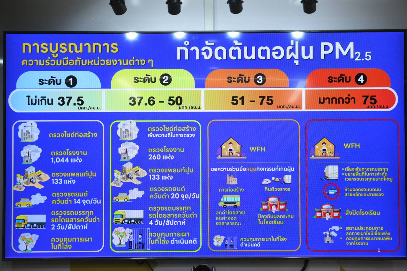 ต่อมา นางสาววรนุช สวยค้าข้าว รองผู้อำนวยการสำนักสิ่งแวดล้อม ได้กล่าวถึงแนวทางปฏิบัติของกทม.ว่า หากค่าฝุ่น PM2.5 เพิ่มสูงขึ้น หน่วยงานที่เกี่ยวข้องจะดำเนินการตามแผนปฏิบัติการฯ 3 ส่วน ได้แก่ เฝ้าระวังและแจ้งเตือน กำจัดต้นตอ และการแนะนำการป้องกันดูแลสุขภาพ ซึ่งกทม.จะนำค่าระดับฝุ่นประกอบกับค่าการพยากรณ์ของกรมควบคุมมลพิษ เพื่อเป็นข้อมูลสถานการณ์และนำมาใช้ในการวางแผนการทำงาน เป็น 4 ระดับ ระดับที่ 1 (ฟ้า) ค่าไม่เกิน 37.5 มคก./ลบ.ม. จะใช้ 15 มาตรการ เช่น ตรวจไซด์ก่อสร้าง ตรวจโรงงาน ให้มีการฉีดพ่นน้ำเพื่อไม่ให้มีการฟุ้งกระจายของฝุ่น ระดับที่ 2 (เหลือง) ค่า 37.6-50 มคก./ลบ.ม. จะมีการเพิ่มความเข้นข้นในการตรวจมากยิ่งขึ้น ระดับที่ 3 (ส้ม) ค่า 51-75 มคก./ลบ.ม. จะมีการแจ้งหน่วยงานที่เกี่ยวข้อง เพื่อประสานงานขอความร่วมมือให้ทำงานแบบ Work From Home 60% รวมถึงลดงานและกิจกรรมที่เกิดฝุ่นละออง ระดับที่ 4 (แดง) ค่ามากกว่า 75 มคก./ลบ.ม. จะขอความร่วมทำงานแบบ Work From Home 100% เพราะเป็นการช่วยลดมลพิษได้เป็นอย่างมากรวมถึงการปิดโรงเรียน เป็นต้น
