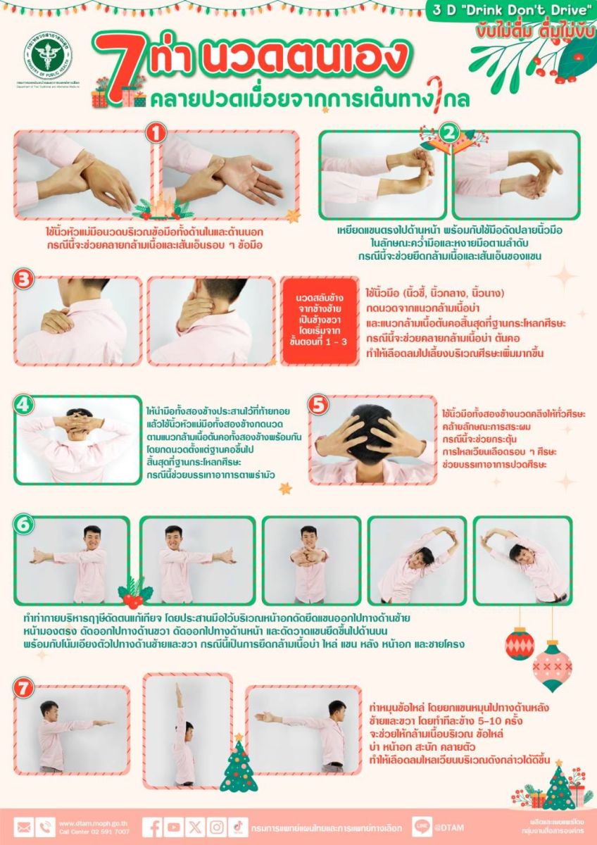 นายแพทย์ขวัญชัย วิศิษฐานนท์ รองอธิบดีกรมการแพทย์แผนไทยและการแพทย์ทางเลือก แนะนำ 7 ท่า การนวดตนเอง ตามศาสตร์การแพทย์แผนไทย ช่วยบรรเทาอาการเหนื่อยล้าและปวดเมื่อย โดยเฉพาะอาการปวดเมื่อยบริเวณกล้ามเนื้อ คอ บ่า ไหล และ แขน ซึ่งเป็นอาการที่พบได้บ่อยจากการนั่งรถเป็นเวลานาน ๆ บางรายมีอาการปวดล้าบริเวณกระบอกตา คลื่นไส้ อาเจียน อีกด้วย