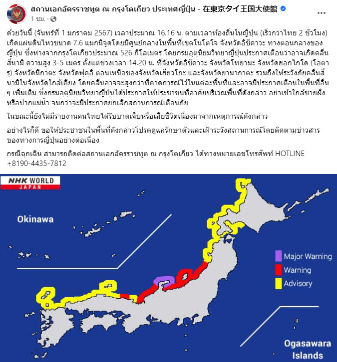 ด้วยวันนี้ (จันทร์ที่ 1 มกราคม 2567) เวลาประมาณ 16.16 น. ตามเวลาท้องถิ่นในญี่ปุ่น (เร็วกว่าไทย 2 ชั่วโมง) เกิดแผ่นดินไหวขนาด 7.6 แมกนิจูดโดยมีศูนย์กลางในพื้นที่เขตโนโตโจ จังหวัดอิชิคาวะ ทางตอนกลางของญี่ปุ่น ซึ่งห่างจากกรุงโตเกียวประมาณ 526 กิโลเมตร โดยกรมอุตุนิยมวิทยาญี่ปุ่นประกาศเตือนว่าอาจเกิดคลื่นสึนามิ ความสูง 3-5 เมตร ตั้งแต่ช่วงเวลา 14.20 น. ที่จังหวัดอิชิคาวะ จังหวัดโทยามะ จังหวัดฮอกไกโด (โอตารุ) จังหวัดนีกาตะ จังหวัดฟุคุอิ ตอนเหนือของจังหวัดเฮียวโกะ และจังหวัดยามากาตะ รวมถึงให้ระวังภัยคลื่นสึนามิในจังหวัดใกล้เคียง โดยคลื่นอาจจะสูงกว่าที่คาดการณ์ไว้ในแต่ละพื้นที่และอาจมีประกาศเตือนในพื้นที่อื่น ๆ เพิ่มเติม ซึ่งกรมอุตุนิยมวิทยาญี่ปุ่นได้ประกาศให้ประชาชนที่อาศัยบริเวณพื้นที่ดังกล่าว อย่าเข้าใกล้ชายฝั่งหรือปากแม่น้ำ จนกว่าจะมีประกาศยกเลิกสถานการณ์เตือนภัย