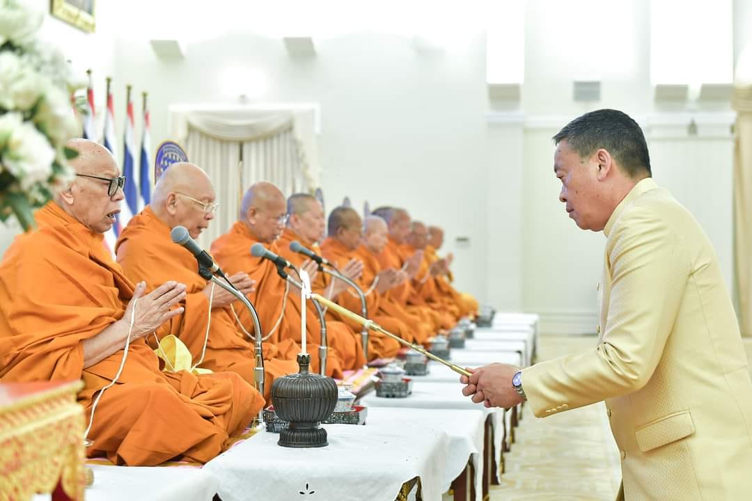 เมื่อนายกรัฐมนตรีและภริยาเดินทางถึงตึกสันติไมตรี (หลังนอก) นายกรัฐมนตรีได้จุดธูปเทียนบูชาพระรัตนตรัย เจ้าหน้าที่อาราธนาศีล พระสงฆ์ให้ศีลและเจริญพระพุทธมนต์ จากนั้นนายกรัฐมนตรีและภริยา รองนายกรัฐมนตรีและภริยา พร้อมด้วยคณะรัฐมนตรี ถวายผ้าไตรและถวายเครื่องไทยธรรมแด่พระสงฆ์ จำนวน 10 รูป พระสงฆ์สวดอนุโมทนา นายกรัฐมนตรีกรวดน้ำรับพร ประธานฝ่ายสงฆ์ประพรมน้ำพระพุทธมนต์