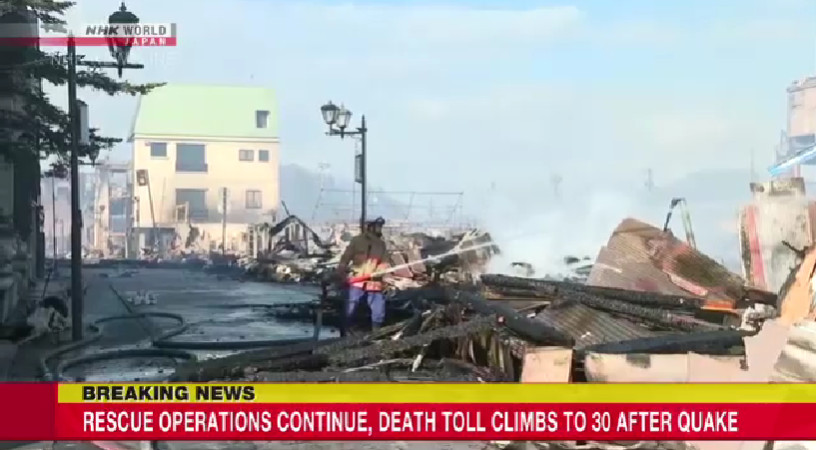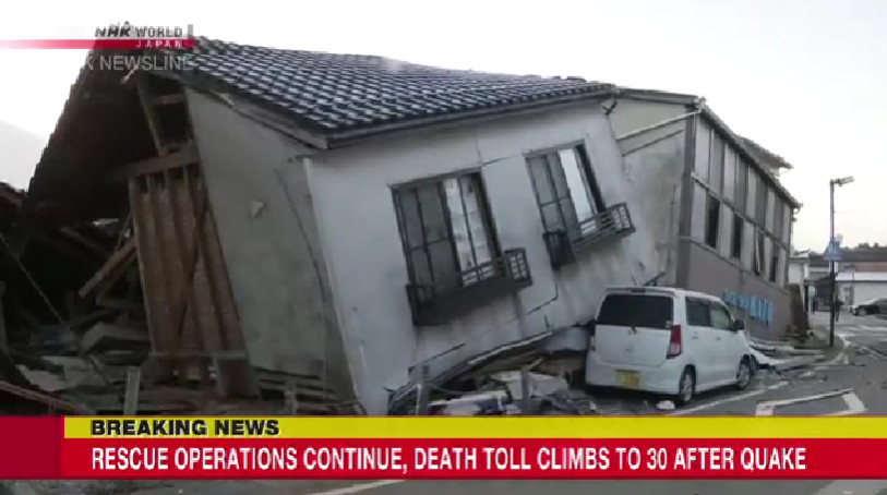 สำนักข่าว NHK ของญี่ปุ่นรายงานว่า ปฏิบัติการกู้ภัยยังคงดำเนินการอยู่หลังจากเกิดแผ่นดินไหวร้ายแรงที่จังหวัดอิชิกาวะ ทางตอนกลางของญี่ปุ่น ในวันปีใหม่ มีผู้เสียชีวิตแล้วอย่างน้อย 30 รายในจังหวัดอิชิคาวะ แต่จำนวนดังกล่าวยังคงอาจเพิ่มขึ้นอีก เนื่องจากยังมีอีกจำนวนมากที่ยังคงติดอยู่ใต้อาคารที่พังทลาย สำนักงานอุตุนิยมวิทยาของญี่ปุ่นยกเลิกคำแนะนำเกี่ยวกับสึนามิตามแนวทะเลญี่ปุ่นทั้งหมด หลังจากเกิดแผ่นดินไหวรุนแรงในพื้นที่เมื่อบ่ายวันจันทร์ แต่เจ้าหน้าที่เตือนว่าอาฟเตอร์ช็อกรุนแรงอาจเกิดขึ้นในสัปดาห์หน้า โดยเฉพาะในช่วง 2-3 วันข้างหน้า