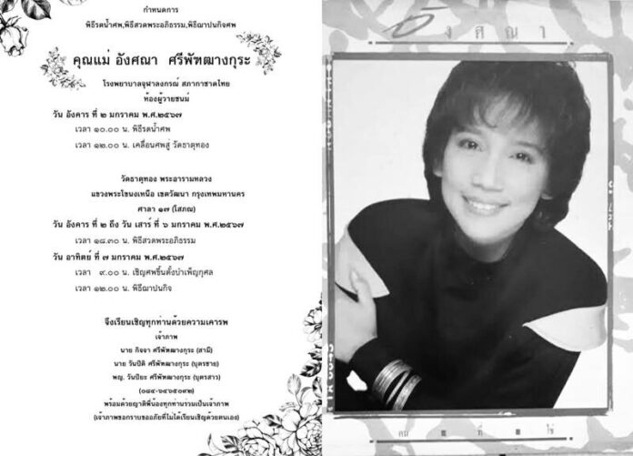 โดยผู้ใชเฟซบุ๊กชื่อ Jaroensook Limbanchongkit Pone ได้เผยข่าวเศร้าแห่งความสูญเสียว่า ข่าวเศร้า "อังศณา ช้างเศวต" (อังศนา ศรีพัฑฒางกุระ) อดีตนักร้องดังยุคปลายทศวรรษ 80 ได้ถึงแก่กรรมเมื่อวันที่ 1 มกราคม 2567 โดยโพสต์กำหนดการ พิธีรดน้ำศพ พิธีสวดพระอภิธรรม พิธีฌาปนกิจศพของ ‘อังศณา ช้างเศวต’ พร้อมระบุข้อความอาลัยว่า “ทุกคนมีอะไรในใจสุขทุกข์กันไปแล้วแต่ สุขใจยังมีปะปนที่ผิดหวังเราทนสู้ไปหันมามองคนอื่นอาจทุกข์ระทมกว่าเรา หนึ่งคนเป็นกำลังใจคนแสนหมื่นพันคนต่อไป” (จากเพลง หนึ่งในหลาย ขับร้องโดย อังศนา ช้างเศวต)