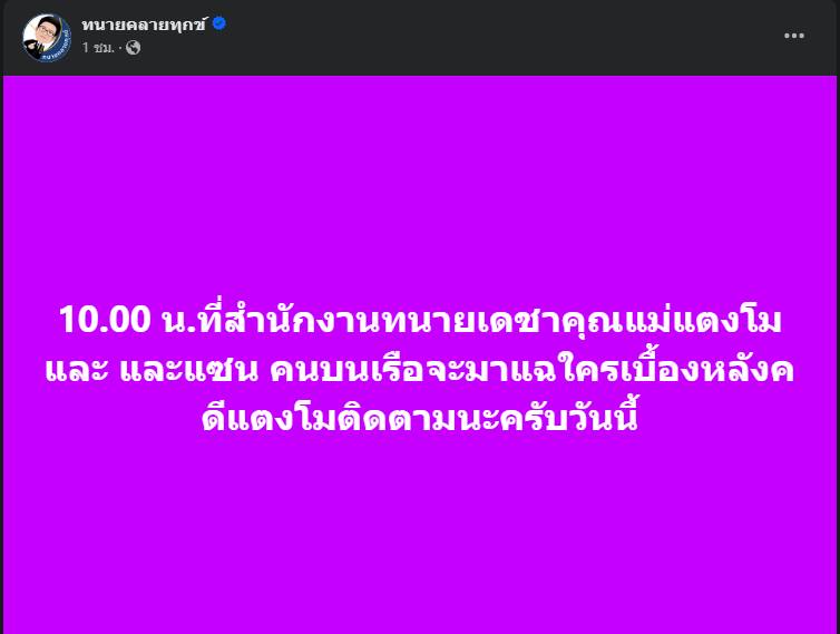 8 ม.ค.2567 ทนายเดชา กิตติวิทยานันท์ โพสต์ผ่านเพจทนายคลายทุกข์ ว่า “10.00 น. ที่สำนักงานทนายเดชา คุณแม่แตงโม และ แซน (วิศาพัช) คนบนเรือ จะมาแฉใครเบื้องหลังคดีแตงโม ติดตามนะครับวันนี้” ทั้งยังบอกด้วยว่า เรียนพี่น้องสื่อมวลชนและประชาชน ทนายเดชาไม่ได้เป็นทนายความให้คุณแม่นะครับเป็นเพียงเพื่อนคนหนึ่งของคุณแม่ เมื่อคุณแม่ร้องขอความช่วยเหลือ ต้องการแถลงข่าว พูดความจริงพร้อมกับคุณแซน ซึ่งอยู่บนเรือคดีแตงโม จึงดำเนินการให้ตามที่ร้องขอ ส่วนเนื้อหาข้อเท็จจริงที่ทั้งสองท่านจะแถลงในวันนี้พี่น้องประชาชนก็ติดตามกันเอาเองนะครับ จากทนายเดชา