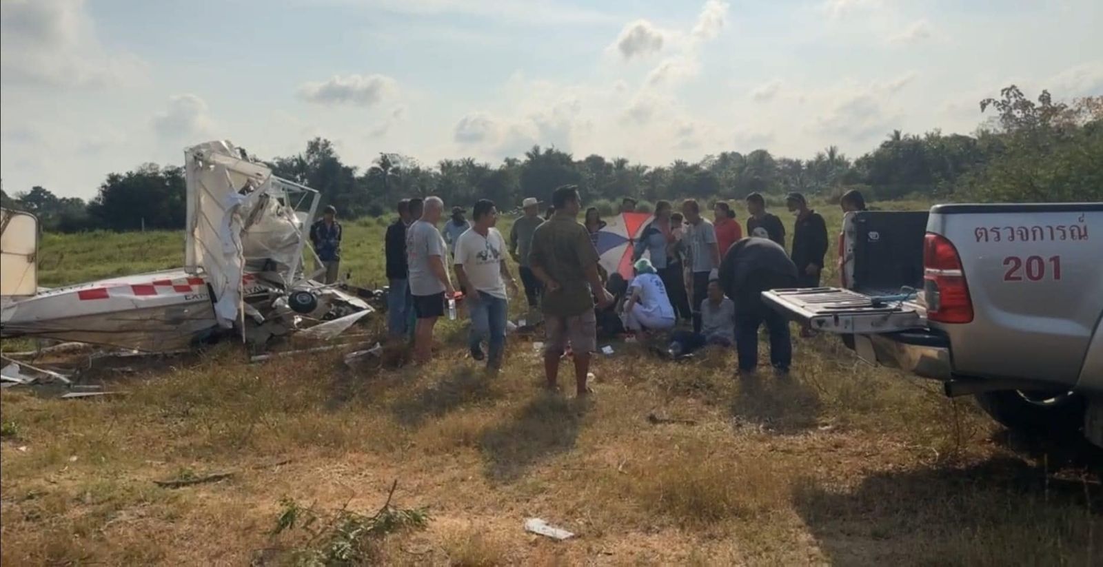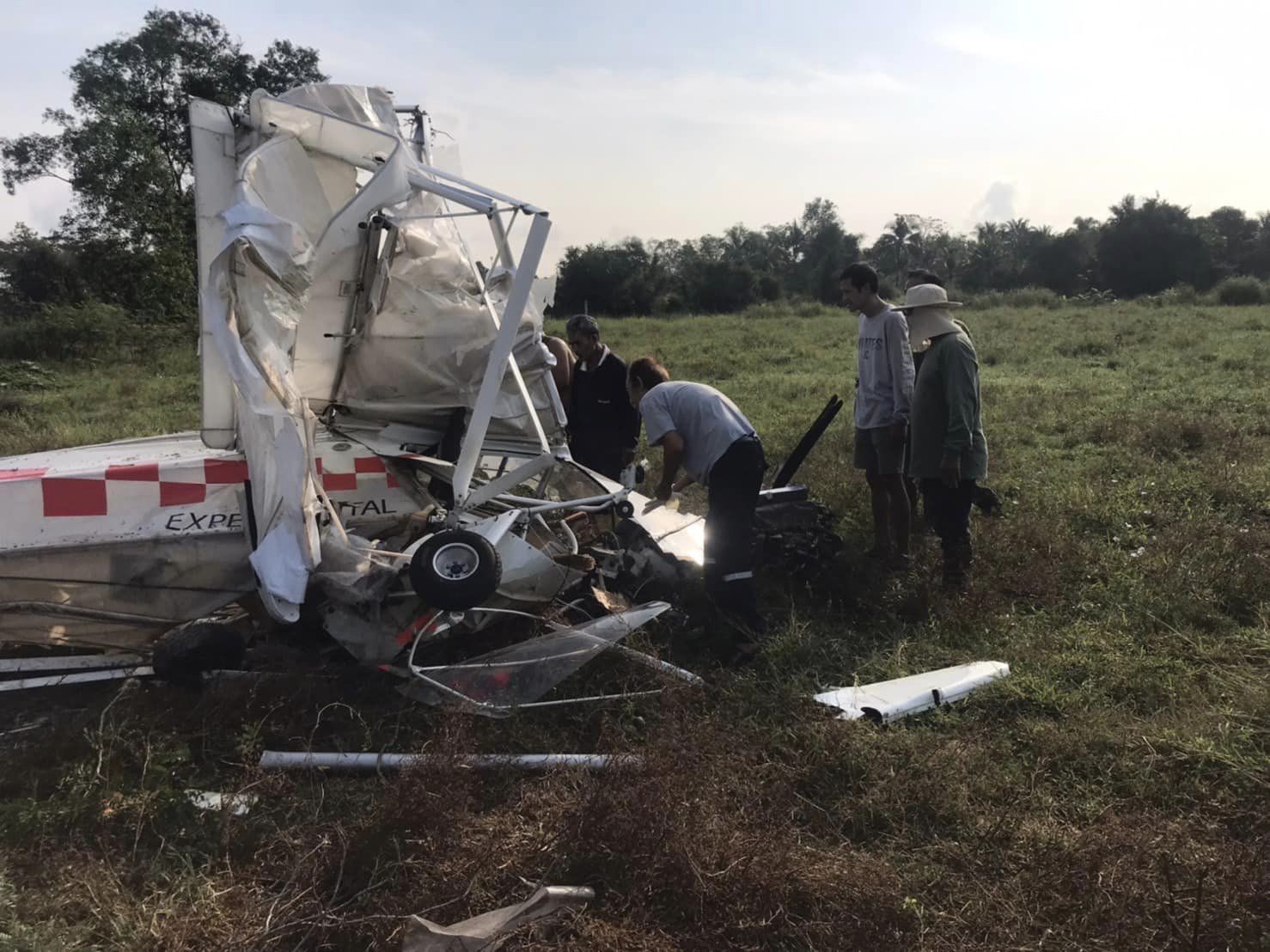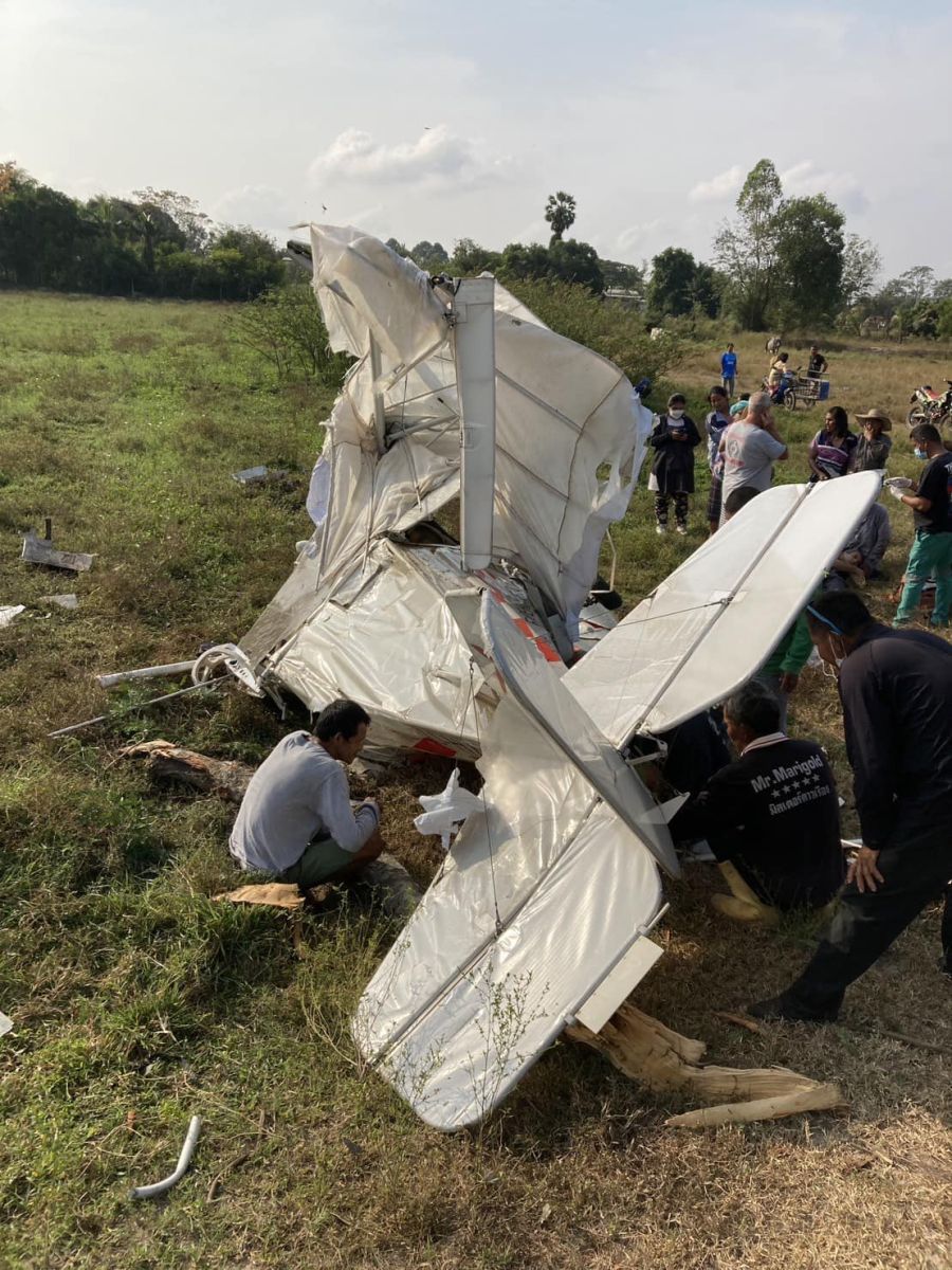 ที่เกิดเหตุ มีชาวบ้านมุงดูเหตุการณ์ด้วยความแตกตื่นเป็นจำนวนมาก หลังพบเครื่องบินเล็กแบบใบพัดเครื่องยนต์เดี่ยว 2 ที่นั่ง หมายเลขประเครื่องบิน ยู-เฮช77 ( U-H77 ) ตกลงกระแทกพื้น ได้รับความเสียหายยับเยิน บนยอดต้นมะขามขนาดใหญ่ ยังพบเศษซากชิ้นส่วนติดคาอยู่ และมีกิ่งมะขามถูกชนจนหักโคน และชิ้นส่วนกระเด็นกระจัดกระจายไปทั่วบริเวณทุ่งนา ตรวจสอบมีผู้ได้รับบาดเจ็บรายแรกทราบชื่อคือ MR.CHRISTIAN LEONARDO SCHUF อายุ 51 ปี สัญชาติเยอรมนี ข้อเท้าหัก จนกระดูกข้อเท้าทะลุโผล่ออกมาข้างนอกทั้ง 2 ข้าง อาการสาหัส ชาวบ้านได้ช่วยเหลือออกมาจากซาก โดยเจ้าหน้าที่กู้ภัยฯ ปฐมพยาบาลเบื้องต้น ก่อนเคลื่อนย้ายส่งโรงพยาบาลอย่างเร่งด่วน ส่วนอีกรายทราบชื่อคือ MR.STEFAN MOLNAR อายุ 50 ปี สัญชาติออสเตรีย ซึ่งเป็นคนขับ เสียชีวิตคาซากเครื่องบิน ในสภาพน่าสยดสยอง เจ้าหน้าที่ต้องใช้ผ้าขาวคลุมกันเป็นที่อุจาดตา พร้อมใช้โปลิศไลน์กั้นห้ามเข้าใกล้พื้นที่เครื่องบินตก เนื่องจากมีกลิ่นน้ำมันคละคลุ้ง เกรงว่าจะเกิดอันตราย
