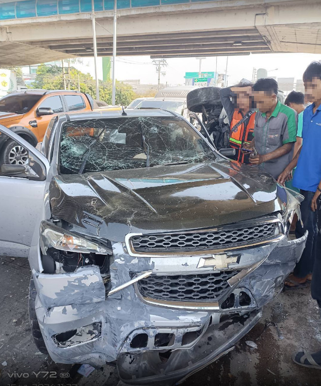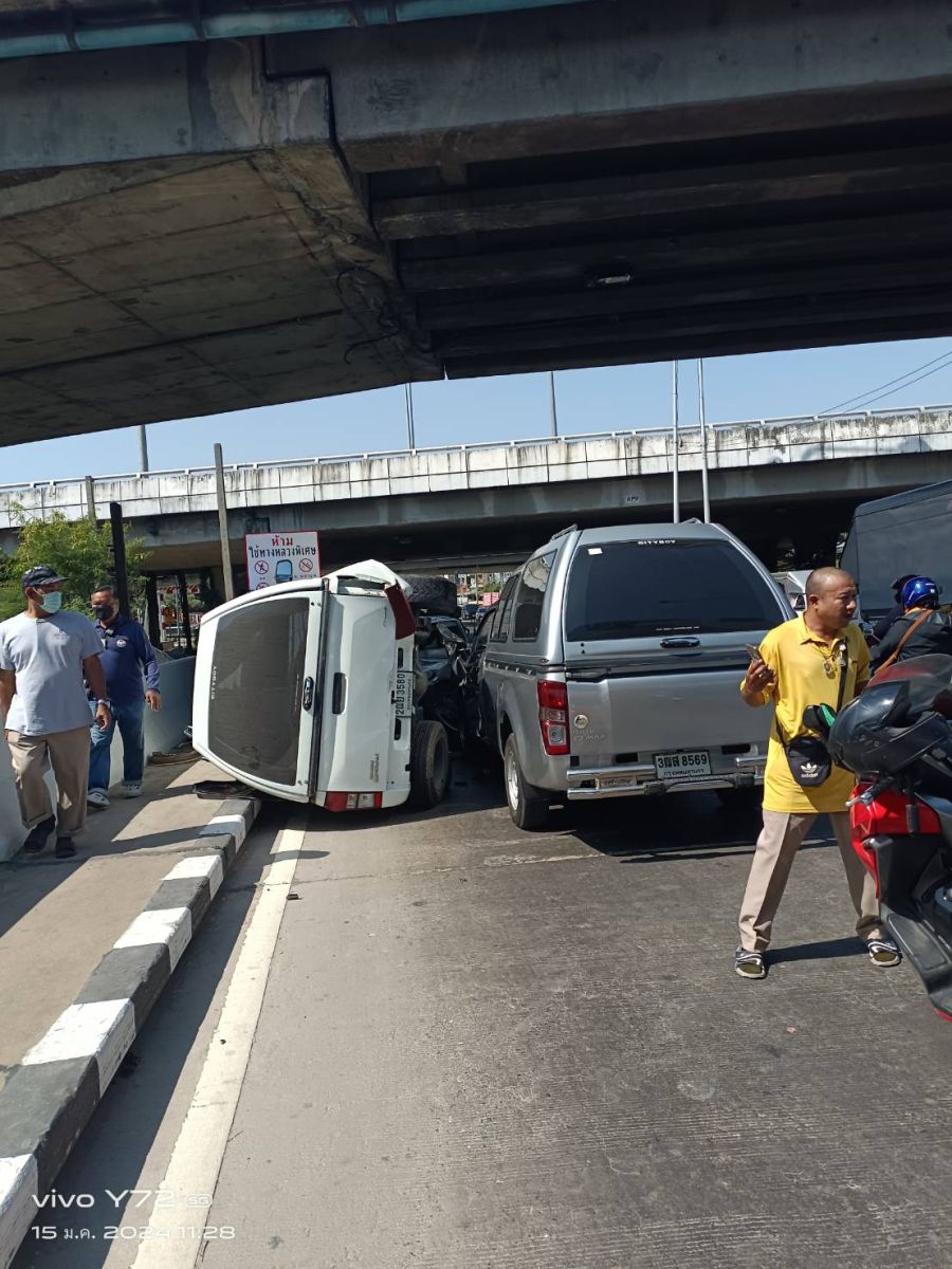 เบื้องต้นผู้เห็นเหตุการณ์เล่าว่า รถกระบะซิ่งแข่งกันมา จากถนนอ่อนนุช ขาออก และข้ามเลนมาฝั่งขาเข้า ชนรถเสียหลายคัน บาดเจ็บ 4 ราย และเสียชีวิต 1 ราย