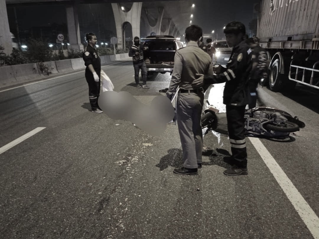 หนุ่มวัย 36 ขี่รถจักรยานยนต์ชนกับรถกระบะแล้วล้มคว่ำ รถพ่วงขับตามหลังทับร่างซ้ำ เสียชีวิตกลางถนนเทพรัตน กม.40
