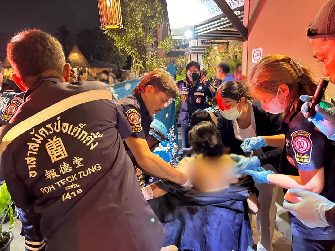 ในที่เกิดเหตุ พบว่ามีผู้บาดเจ็บเป็นผู้หญิง 1 รายตรวจสอบเอกสาร เป็นหญิงไทย อายุ 38 ปี เป็นแม่บ้านของทางร้าน มีบาดแผลถูกแทงที่แขนซ้าย หัวไหล่ทั้งสองข้าง ใต้ราวนม แผ่นหลังและลำคอ รวมเกือบ 10 แผล เจ้าหน้าที่เร่งปฐมพยาบาลและให้การช่วยเหลือนำตัวส่งโรงพยาบาลบางพลี