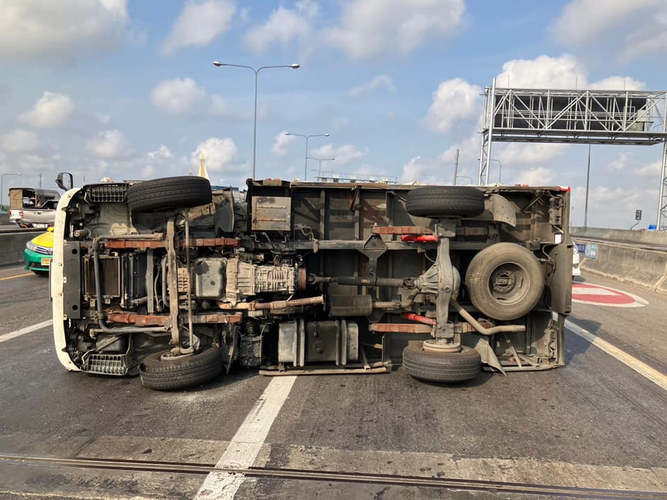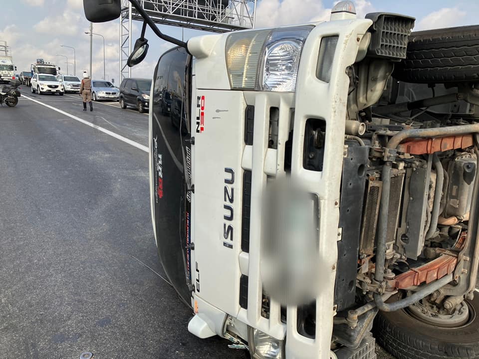 ทางพิเศษกาญจนาภิเษก (บางพลี-สุขสวัสดิ์) จากพระราม 2 มุ่งหน้าบางแก้ว ช่วงเชิงทางลงสะพานกาญจนาภิเษก รถบรรทุก 4 ล้อเล็ก พลิกตะแคงกีดขวางเลนกลาง รถติดหนักมาก ท้ายแถวสะสมเหนือโรงเรียนสวนกุหลาบวิทยาลัย ธนบุรี ส่วนฝั่งกลับกัน ติดเพราะรถชะลอตัวดู #รายงานจราจร #อุบัติเหตุ #FM91