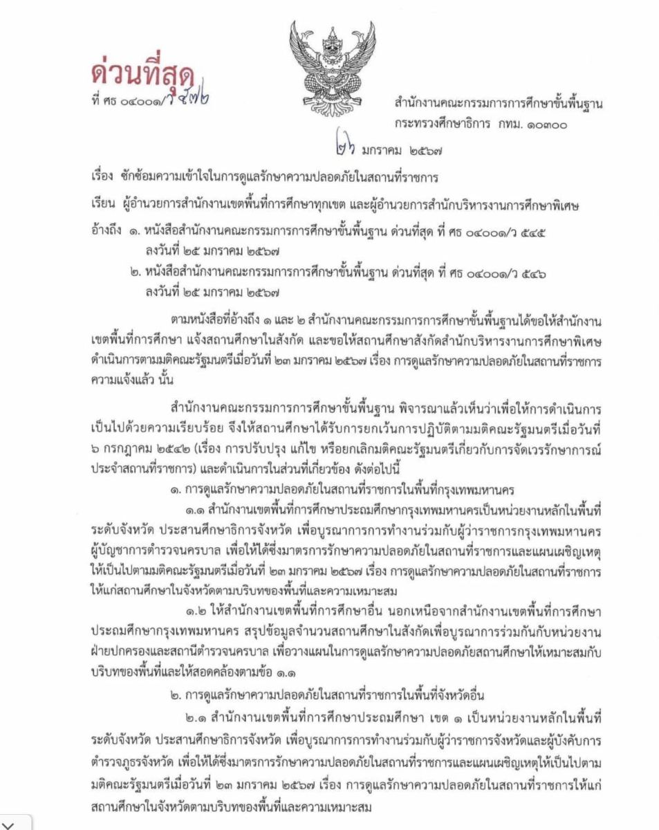 นายธีร์ ภวังคนันท์ รองเลขาธิการคณะกรรมการการศึกษาขั้นพื้นฐาน (กพฐ.) ปฏิบัติราชการแทน เลขาธิการคณะกรรมการการศึกษาขั้นพื้นฐาน มีหนังสือด่วนที่สุด ถึง ผู้อำนวยการสำนักงานเขตพื้นที่การศึกษา (สพท.) ทุกเขต เรื่อง ซักซ้อมความเข้าใจในการดูแลรักษาความปลอดภัยในสถานที่ราชการ