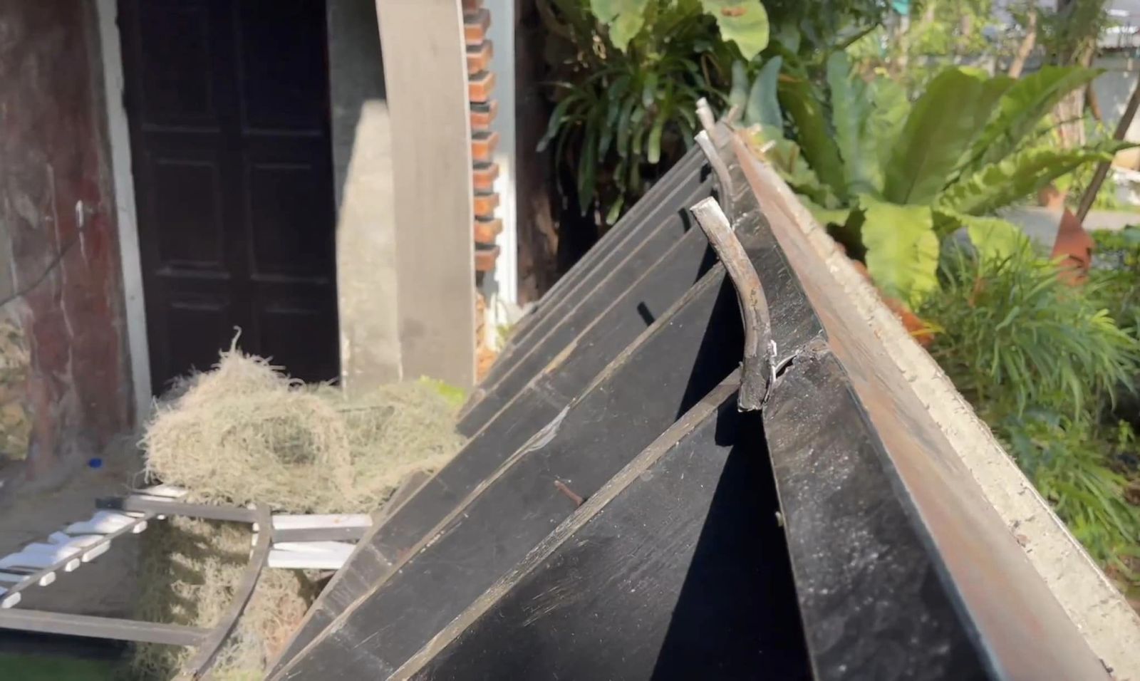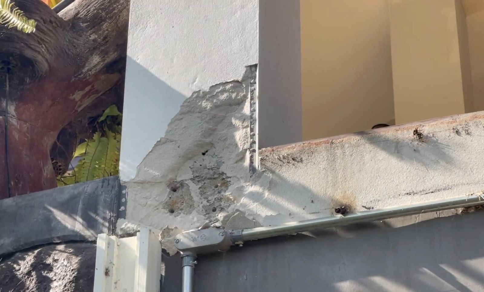 ส่วนสภาพความเสียหายพบระเบียงปูนความยาวประมาณ 5 เมตร กว้าง 1 เมตร พังถล่มลงมาจากชั้นสองของตัวอาคาร ตัวอาคารพบมีเหล็กเส้นที่ใช้ยึดระเบียงหักคาอยู่