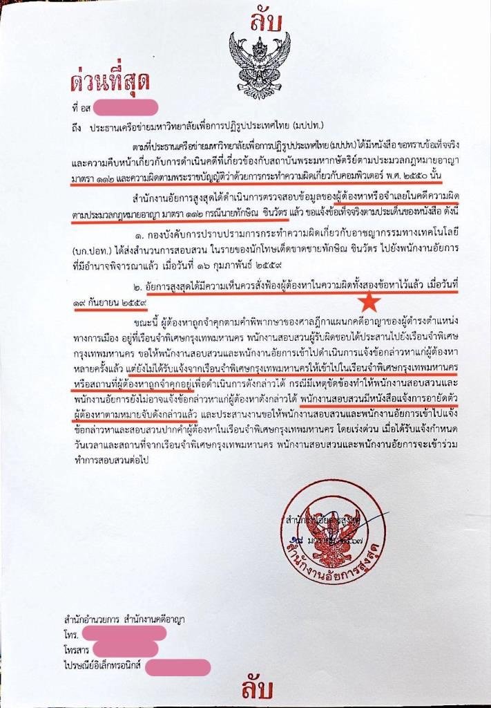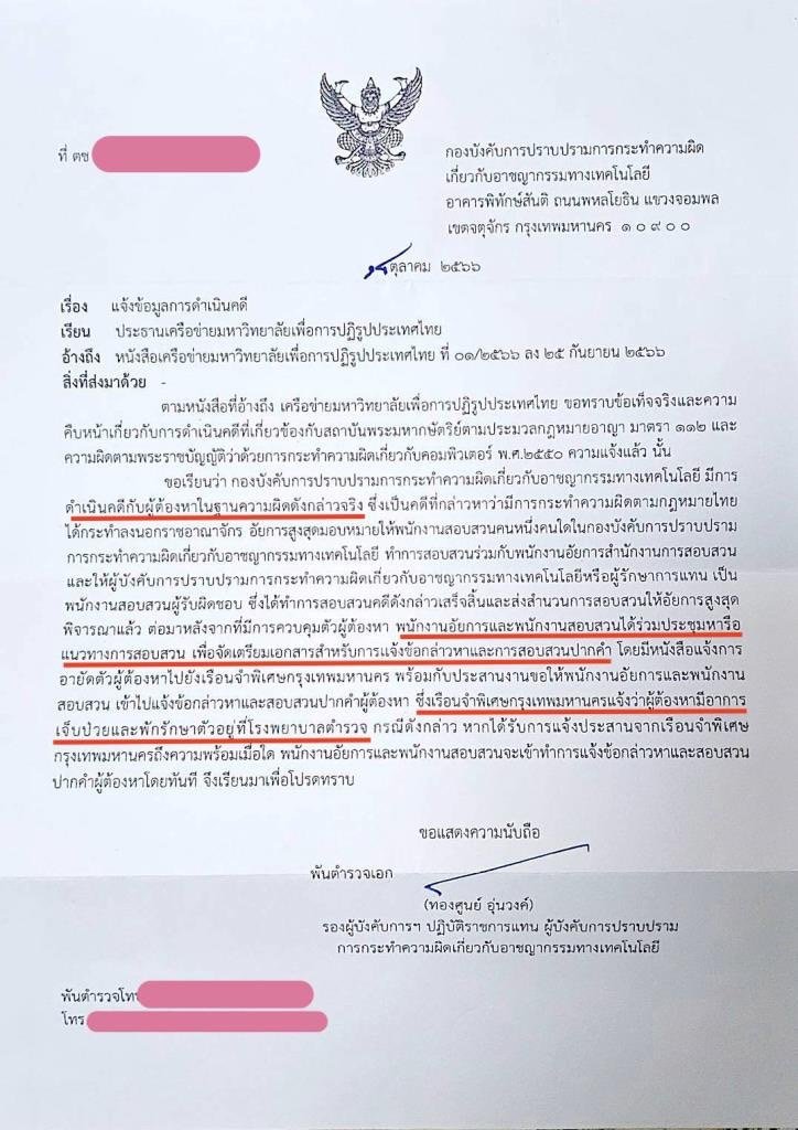 และอีกฉบับหนึ่ง เป็นหนังสือจาก พ.ต.อ.ทองศูนย์ อุ่นวงศ์ รองผู้บังคับการฯ ปฏิบัติราชการแทนผู้บังคับการปราบปรามการกระทําความผิดเกี่ยวกับอาชญากรรมทางเทคโนโลยี (บก.ปอท.) แจ้งข้อมูลการดําเนินคดี อ้างถึง หนังสือเครือข่ายมหาวิทยาลัยเพื่อการปฏิรูปประเทศไทย ที่ 01/2560 ลงวันที่ 25 ก.ย.2566 ระบุว่า ตามหนังสือที่อ้างถึง เครือข่ายมหาวิทยาลัยเพื่อการปฏิรูปประเทศไทย ขอทราบข้อเท็จจริงและความคืบหน้าเกี่ยวกับการดําเนินคดีที่เกี่ยวข้องมาตรา 112 และความผิดตามพ.ร.บ.คอมพิวเตอร์ พ.ศ.2550