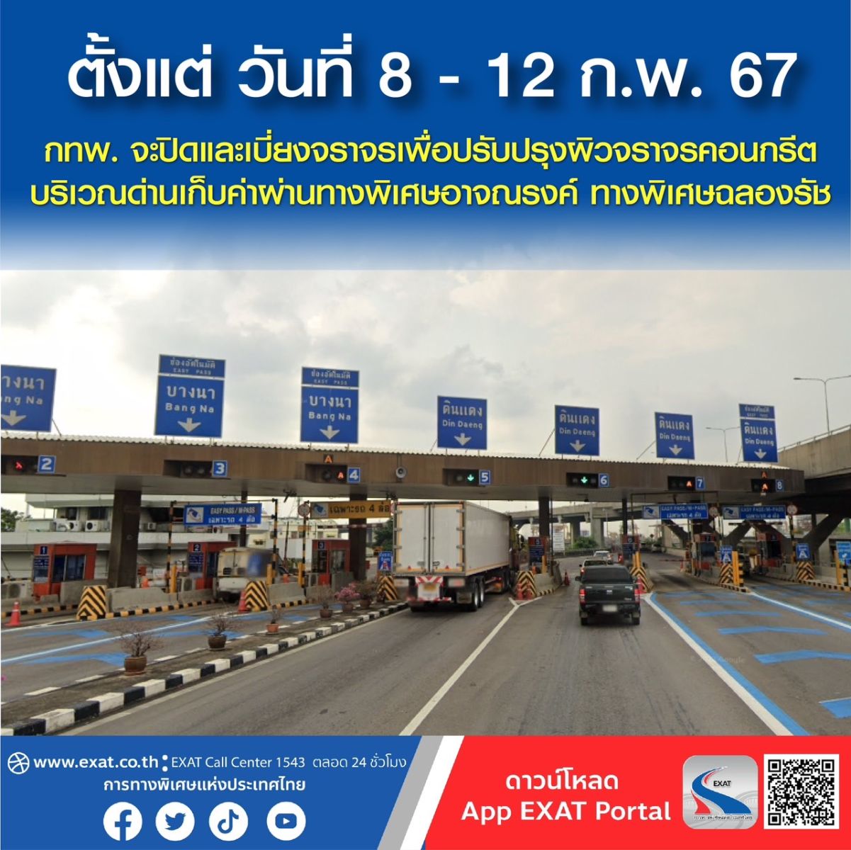 กทพ. ปิดเบี่ยงจราจรบริเวณด่านเก็บค่าผ่านทางพิเศษอาจณรงค์ ทางพิเศษฉลองรัช ตั้งแต่วันที่ 8 - 12 กุมภาพันธ์ 2567 เพื่อดำเนินการซ่อมแซมผิวจราจรคอนกรีต