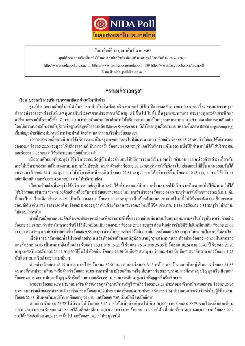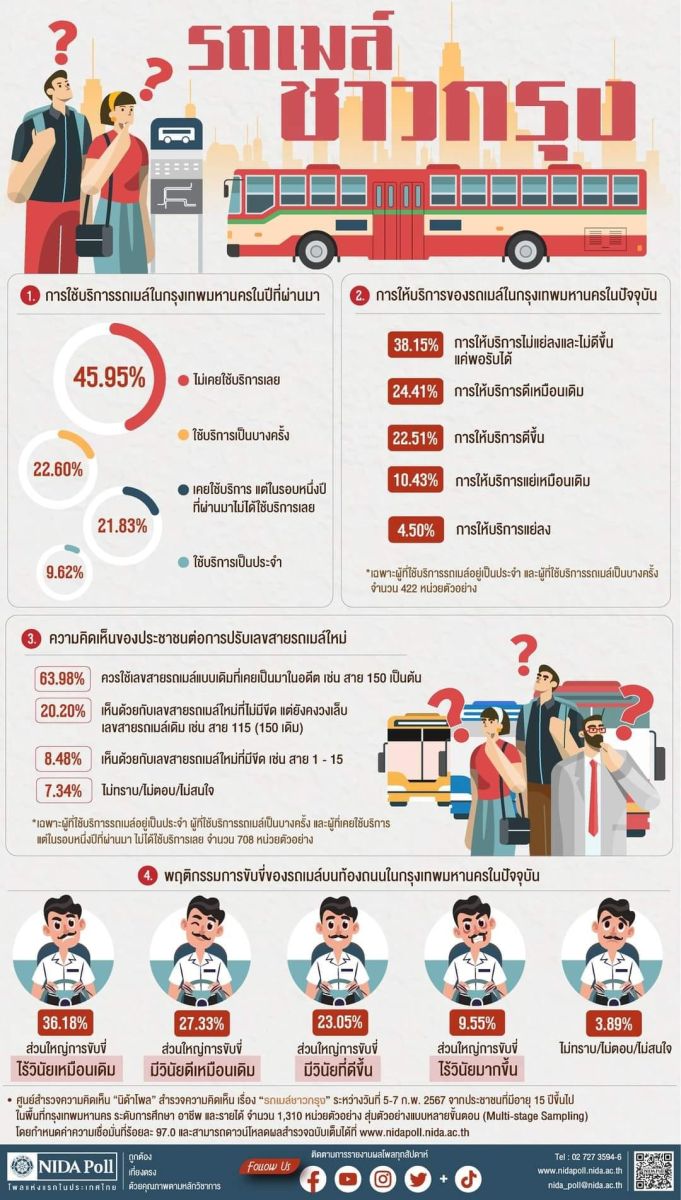เฟซบุ๊ก NIDA Poll ศูนย์สำรวจความคิดเห็น “นิด้าโพล” สถาบันบัณฑิตพัฒนบริหารศาสตร์ (นิด้า) เปิดเผยผลสำรวจของประชาชน เรื่อง “รถเมล์ชาวกรุง” ทำการสำรวจระหว่างวันที่ 5-7 กุมภาพันธ์ 2567 จากประชาชนที่มีอายุ 15 ปีขึ้นไป ในพื้นที่กรุงเทพมหานคร กระจายทุกระดับการศึกษา อาชีพ และรายได้ รวมทั้งสิ้น จำนวน 1,310 หน่วยตัวอย่าง เกี่ยวกับการให้บริการของรถเมล์ในกรุงเทพมหานคร การสำรวจอาศัยการสุ่มตัวอย่าง โดยใช้ความน่าจะเป็นจากบัญชีรายชื่อฐานข้อมูลตัวอย่างหลัก (Master Sample) ของ “นิด้าโพล” สุ่มตัวอย่างแบบหลายขั้นตอน (Multi-stage Sampling) เก็บข้อมูลด้วยวิธีการสัมภาษณ์ทางโทรศัพท์ โดยกำหนดค่าความเชื่อมั่น ร้อยละ 97.0