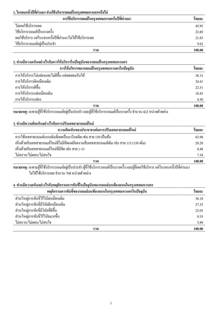 จากการสำรวจเมื่อถามถึงการใช้บริการรถเมล์ในกรุงเทพมหานครในปีที่ผ่านมา พบว่า ตัวอย่าง ร้อยละ 45.95 ระบุว่า ไม่เคยใช้บริการเลย รองลงมา ร้อยละ 22.60 ระบุว่า ใช้บริการรถเมล์เป็นบางครั้ง ร้อยละ 21.83 ระบุว่า เคยใช้บริการ แต่ในรอบหนึ่งปีที่ผ่านมาไม่ได้ใช้บริการเลย และร้อยละ 9.62 ระบุว่า ใช้บริการรถเมล์อยู่เป็นประจำ