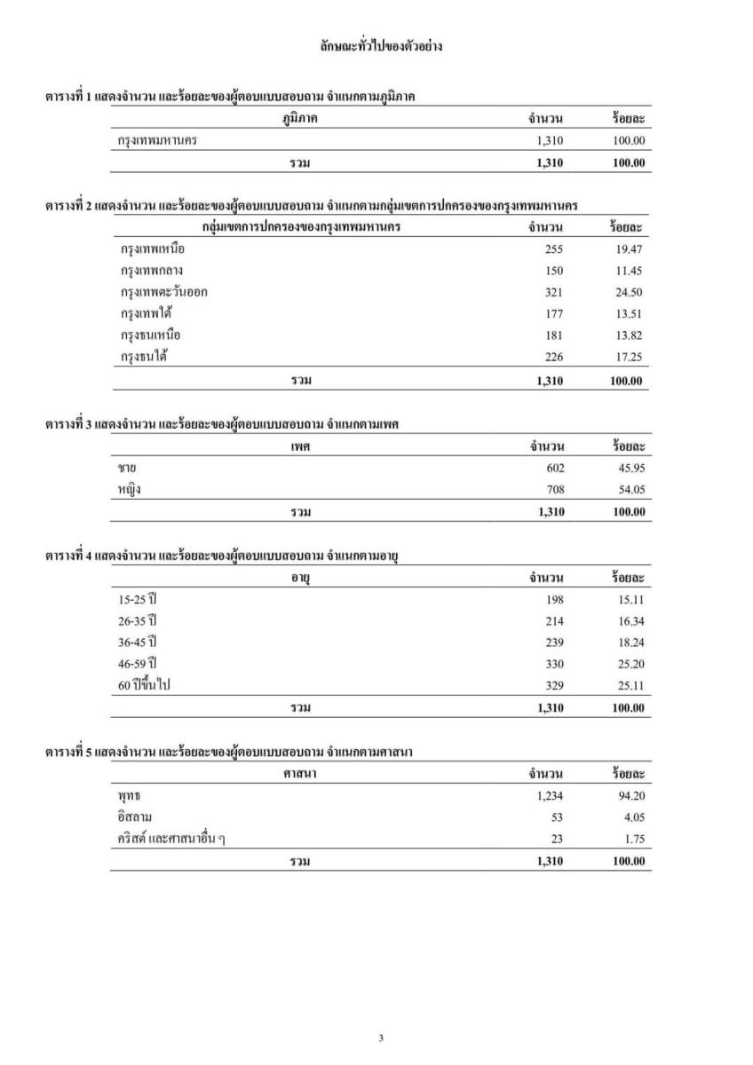 เมื่อพิจารณาลักษณะทั่วไปของตัวอย่าง พบว่า ตัวอย่างทั้งหมดมีภูมิลำเนาอยู่กรุงเทพมหานคร ตัวอย่าง ร้อยละ 45.95 เป็นเพศชาย และร้อยละ 54.05 เป็นเพศหญิง ตัวอย่าง ร้อยละ 15.11 อายุ 15-25 ปี ร้อยละ 16.34 อายุ 26-35 ปี ร้อยละ 18.24 อายุ 36-45 ปี ร้อยละ 25.20 อายุ 46-59 ปี และร้อยละ 25.11 อายุ 60 ปีขึ้นไป ตัวอย่าง ร้อยละ 94.20 นับถือศาสนาพุทธ ร้อยละ 4.05 นับถือศาสนาอิสลาม และร้อยละ 1.75 นับถือศาสนาคริสต์ และศาสนาอื่น ๆ