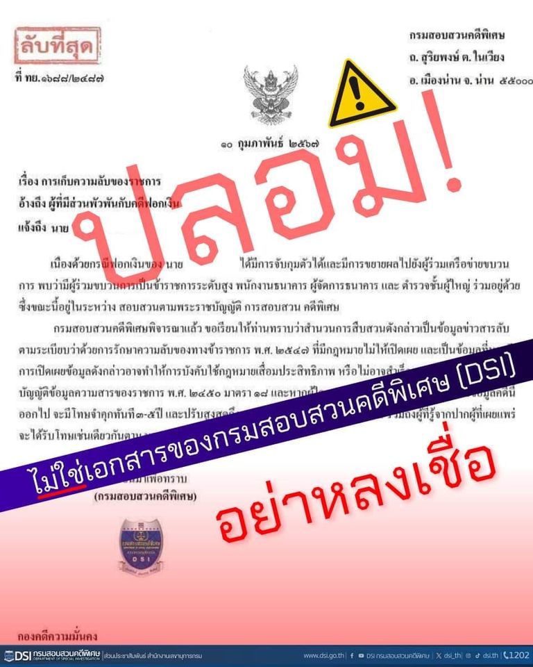 ด้วยกรมสอบสวนคดีพิเศษตรวจพบว่ามีการเผยแพร่ภาพหนังสือราชการจากกรมสอบสวนคดีพิเศษถึงประชาชนปรากฏตามโซเชียลมีเดียโดยเป็นหนังสือลับที่สุด อ้างว่ากรมสอบสวนคดีพิเศษอยู่ระหว่างการสืบสวนสอบสวนคดีความผิดฐานฟอกเงินและมีการขยายผลไปยังข้าราชการระดับสูง เจ้าหน้าที่ธนาคาร รวมถึงข้าราชการตำรวจชั้นผู้ใหญ่และเตือนเรื่องการเปิดเผยข้อมูล สุดท้ายให้ส่งเอกสารส่วนตัว เช่น บัตรประชาชน ซึ่งมีความเสี่ยงจะถูกนำไปใช้โดยมิชอบด้วยกฎหมาย
