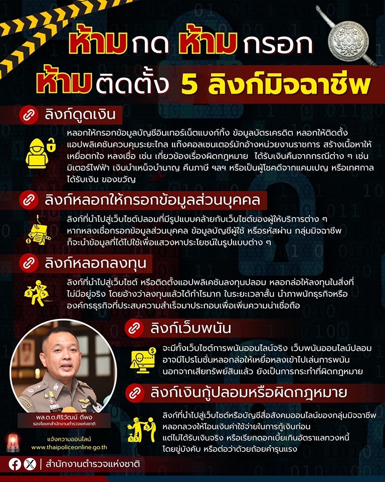 (25 ก.พ.2567) พล.ต.ต.ศิริวัฒน์ ดีพอ รองโฆษกสำนักงานตำรวจแห่งชาติ กล่าวว่า พล.ต.อ.ต่อศักดิ์ สุขวิมล ผบ.ตร. มีความห่วงใยพี่น้องประชาชนที่อาจได้รับความเสียหายจากอาชญากรรมรูปแบบต่าง ๆ ซึ่งในปัจจุบันกลุ่มมิจฉาชีพยังคงมีการพัฒนารูปแบบในการหลอกลวงพี่น้องประชาชนอยู่เสมอ มีการนำหลักจิตวิทยา “รัก โลภ ตกใจ เชื่อใจ” มาปรับใช้ในการหลอกล่อให้ผู้เสียหายหลงเชื่อ และมักพบว่ากลุ่มมิจฉาชีพจะมีการนำลิงก์รูปแบบต่าง ๆ มาใช้เป็นเครื่องมือในการกระทำความผิด ถ้าผู้เสียหายหลงเชื่อกดลิงก์ แล้วกรอกข้อมูลหรือติดตั้งแอปพลิเคชันจากลิงก์ดังกล่าว ก็จะตกเป็นเหยื่อของมิจฉาชีพในที่สุด