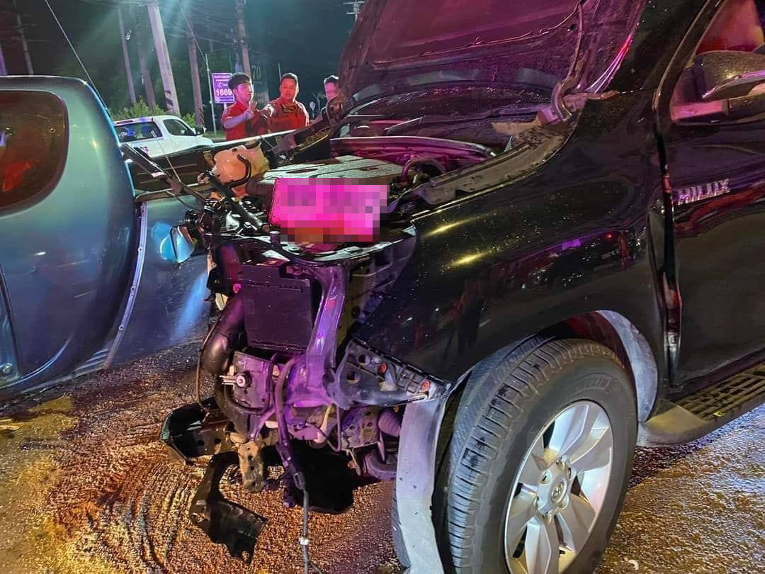 ที่เกิดเหตุ พบรถกระบะยี่ห้อโตโยต้า รีโว่ สีดำ ป้ายทะเบียน เพชรบูรณ์ สภาพด้านหน้าพังยับเยิน ใกล้กันพบรถกระบะยี่ห้อมิตซูบิชิ ไทรทัล สีน้ำเงิน ป้ายทะเบียน ชลบุรี สภาพด้านหน้าพังยับเช่นกัน มีผู้เสียชีวิตรวม 2 ราย และบาดเจ็บสาหัส รวม 5 ราย กู้ภัยฯปฐมพยาบาลบาดแผลเบื้องต้นและนำส่ง รพ.ชลบุรี