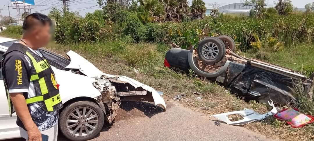 ที่เกิดเหตุ พบรถยนต์นั่งส่วนบุคคล ยี่ห้อโตโยต้า วีออส สีขาว หมายเลขทะเบียน มุกดาหาร จอดอยู่กลางถนน บริเวณด้านหน้าได้รับความเสียหายอย่างมาก ใกล้กันยังพบกระบะ ยี่ห้อมิตซูบิชิ ไทรทัน สีดำ หมายเลขทะเบียน มุกดาหาร พลิกหงายท้องคว่ำล้อชี้ฟ้าตกอยู่ข้างริมทาง บริเวณด้านประตูคนนั่งกระบะได้รับความเสียหาย เจ้าหน้าที่กู้ชีพและพลเมืองดีได้ช่วยกันนำตัวคนขับรถกระบะ และผู้โดยสารมากับรถรวม 5 คน ออกจากรถ นำส่งโรงพยาลมุกดาหาร 4 คน และพบรถกระบะสไลด์ สีขาว หมายเลขทะเบียน กรุงเทพมหานคร จอดตรงข้ามอีกเลน สภาพบริเวณด้านหน้าของรถพังยับหม้อน้ำแตก