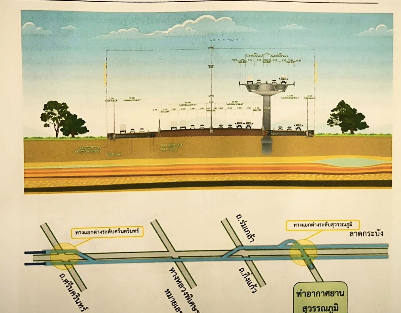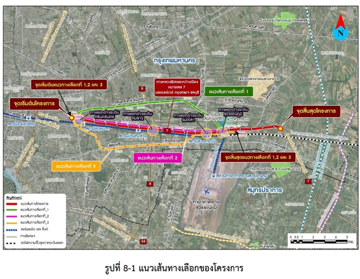 รูปที่ 1 แนวเส้นทางที่เหมาะสมของโครงการการศึกษาและคัดเลือกรูปแบบทางเลือกที่เหมาะสมของโครงการ ประกอบด้วย ตำแหน่งทางยกระดับของโครงการที่เหมาะสม ได้แก่ รูปแบบที่ 1 ทิศใต้ของทางหลวงพิเศษระหว่างเมืองหมายเลข 7 (ขวาทาง) ทางยกระดับมีจุดเริ่มต้น ต่อจากจุดสิ้นสุดของทางพิเศษศรีรัช (ส่วน D) บริเวณเกาะแบ่ง ระหว่างทางหลวงพิเศษและทางบริการ ของทั้ง 2 ทิศทาง ทิศทางละ 2 ช่องจราจร และจะวิ่งผ่านทางต่างระดับศรีนครินทร์ จากนั้นทางยกระดับด้านเหนือจะเบี่ยงแนว ลงมารวมกับด้านทิศใต้เป็น ถนนขนาด 4 ช่องจราจร (ไป - กลับ) ระยะทางประมาณ 10 กม. ผ่านจุดตัดทางหลวงพิเศษระหว่างเมืองหมายเลข 9 และจะแยกออกเป็นสองฝั่ง ฝั่งละ 2 ช่องจราจร ต่อทิศทางเช่นเดิม และจะวิ่งผ่านทางต่างระดับร่มเกล้า ผ่านทางแยกต่างระดับสุวรรณภูมิ โดยบริเวณนี้โครงสร้างจะมีทางแยกออก เพื่อเชื่อมต่อทางต่างระดับท่าอากาศยานสุวรรณภูมิทั้งขาเข้าและขาออก จากนั้นแนวเส้นทางหลักจะมุ่งหน้าไปทางทิศตะวันออกตามทางหลวงพิเศษระหว่างเมืองหมายเลข 7 และลดระดับลงเป็นถนนระดับดินที่จุดสิ้นสุดโครงการ ดังรูปที่ 2