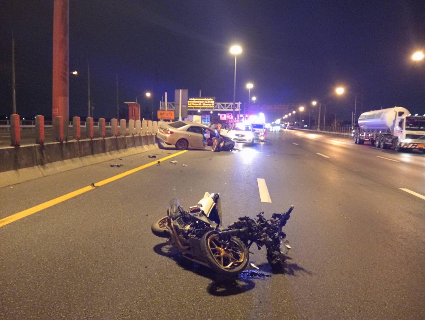 ที่เกิดเหตุ พบรถจักรยานยนต์ ฮอนด้า พีซีเอ็กซ์ สีขาว ป้ายทะเบียน -929 กทม. ล้มคว่ำในสภาพหน้ารถพังยังอยู่กลางถนน ใกล้กันพบรถนั่งส่วนบุคคล โตโยต้า อัลติส สีเทา ป้ายทะเบียน - 3298 กทม. สภาพท้ายรถจอดเกยขอบทาง ที่หน้ารถและล้อรถฝั่งหน้าขวาพังเสียหาย และพบผู้เสียชีวิต 1 คนตรวจสอบเอกสาร เป็นชายไทย อายุ 32 ปี ในส่วนของสาเหตุอยู่ระหว่างการสอบสวนของเจ้าหน้าที่ตำรวจ สทล.8