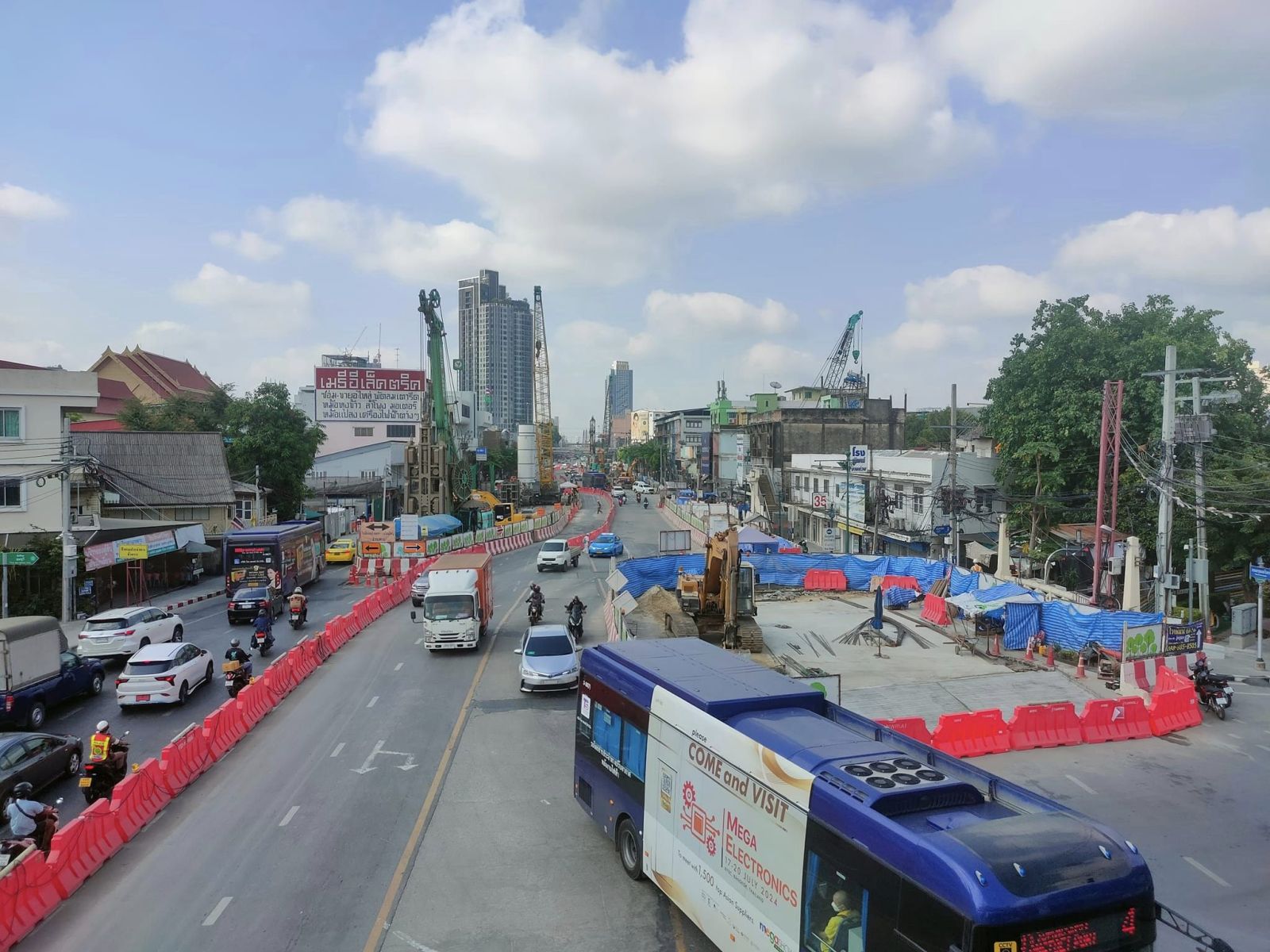 นายกิตติ เอกวัลลภ ผู้ช่วยผู้ว่าการ รฟม. ในฐานะผู้อำนวยการโครงการรถไฟฟ้าสายสีม่วง ช่วงเตาปูน – ราษฎร์บูรณะ (วงแหวนกาญจนาภิเษก) กล่าวว่า การดำเนินงานดังกล่าว เป็นการดำเนินงานในส่วนของโครงการรถไฟฟ้าสายสีม่วงฯ สัญญาที่ 3 ช่วงผ่านฟ้า – สะพานพุทธฯ ซึ่งอยู่ระหว่างเตรียมงานขุดเจาะอุโมงค์ บริเวณสถานีสะพานพุทธฯ โดยตั้งแต่วันศุกร์ที่ 22 มีนาคม 2567 ที่ผ่านมา ได้เริ่มปิดเบี่ยงจราจรบริเวณทางลงสะพานพระปกเกล้า ถึงอนุสรณ์สถานงานสมโภช 100 ปี (วงเวียนเล็ก) 1 ช่องจราจรตลอด 24 ชั่วโมง มีผลให้ผู้สัญจรผ่านถนนประชาธิปก ฝั่งขาออก สามารถสัญจรได้ 2 ช่องจราจร แต่เนื่องจากสภาพพื้นที่ก่อสร้างมีสภาพการจราจรที่ค่อนข้างหนาแน่น และมีชุมชน โรงเรียนโดยรอบ รฟม. และผู้รับจ้างก่อสร้างงานโยธา จึงได้ประสานขอความร่วมมือจากตำรวจนครบาลและสถานีตำรวจในพื้นที่ เพื่อหามาตรการร่วมกันในการลดผลกระทบต่อผู้ใช้เส้นทางตลอดระยะเวลาการดำเนินงาน ซึ่งได้ข้อสรุปร่วมกันโดยการปรับทิศทางการสัญจรของสะพานพุทธยอดฟ้าและสะพานพระปกเกล้าเพื่อเป็นการลดผลกระทบดังกล่าว