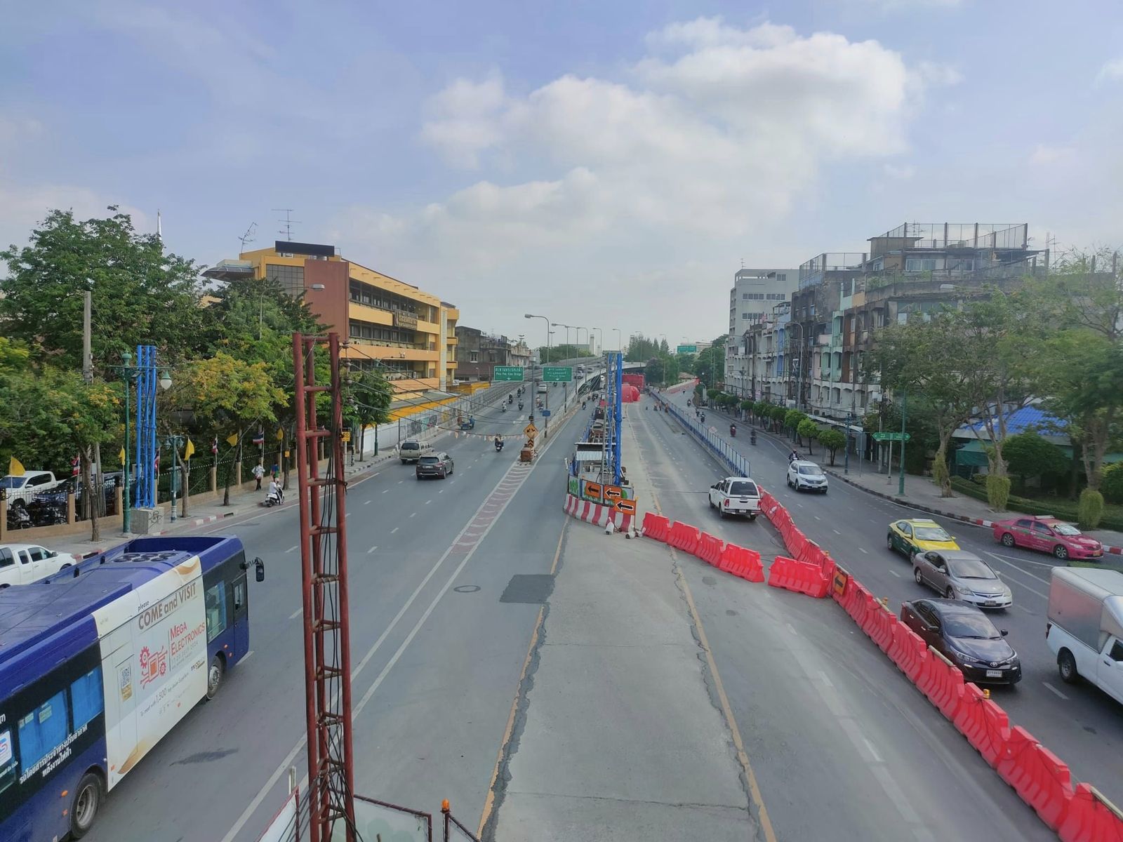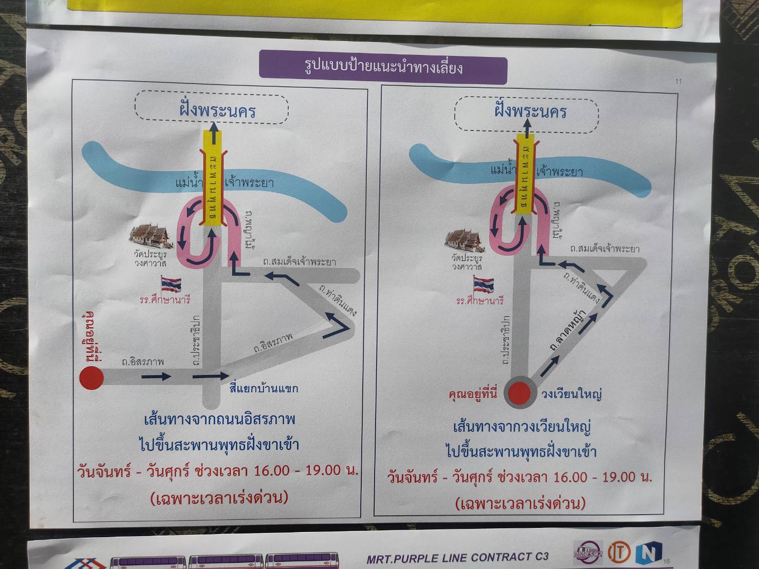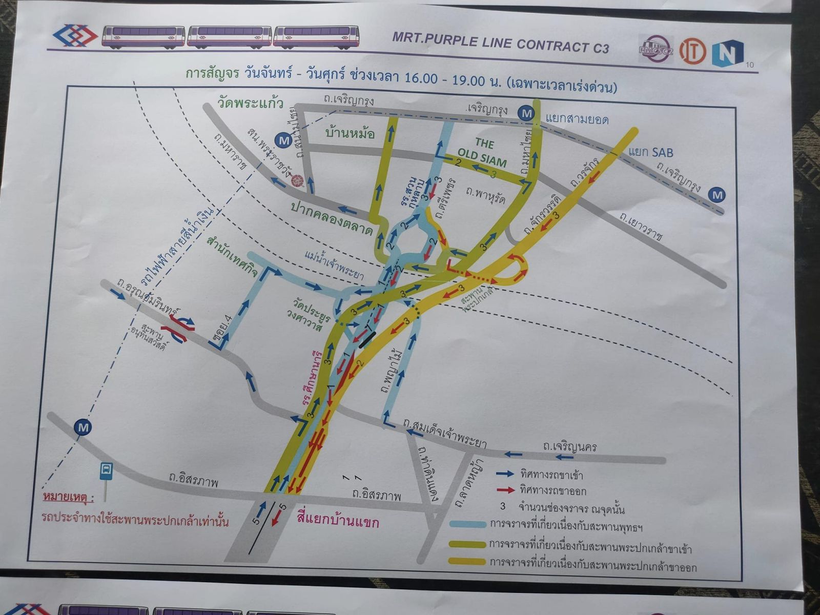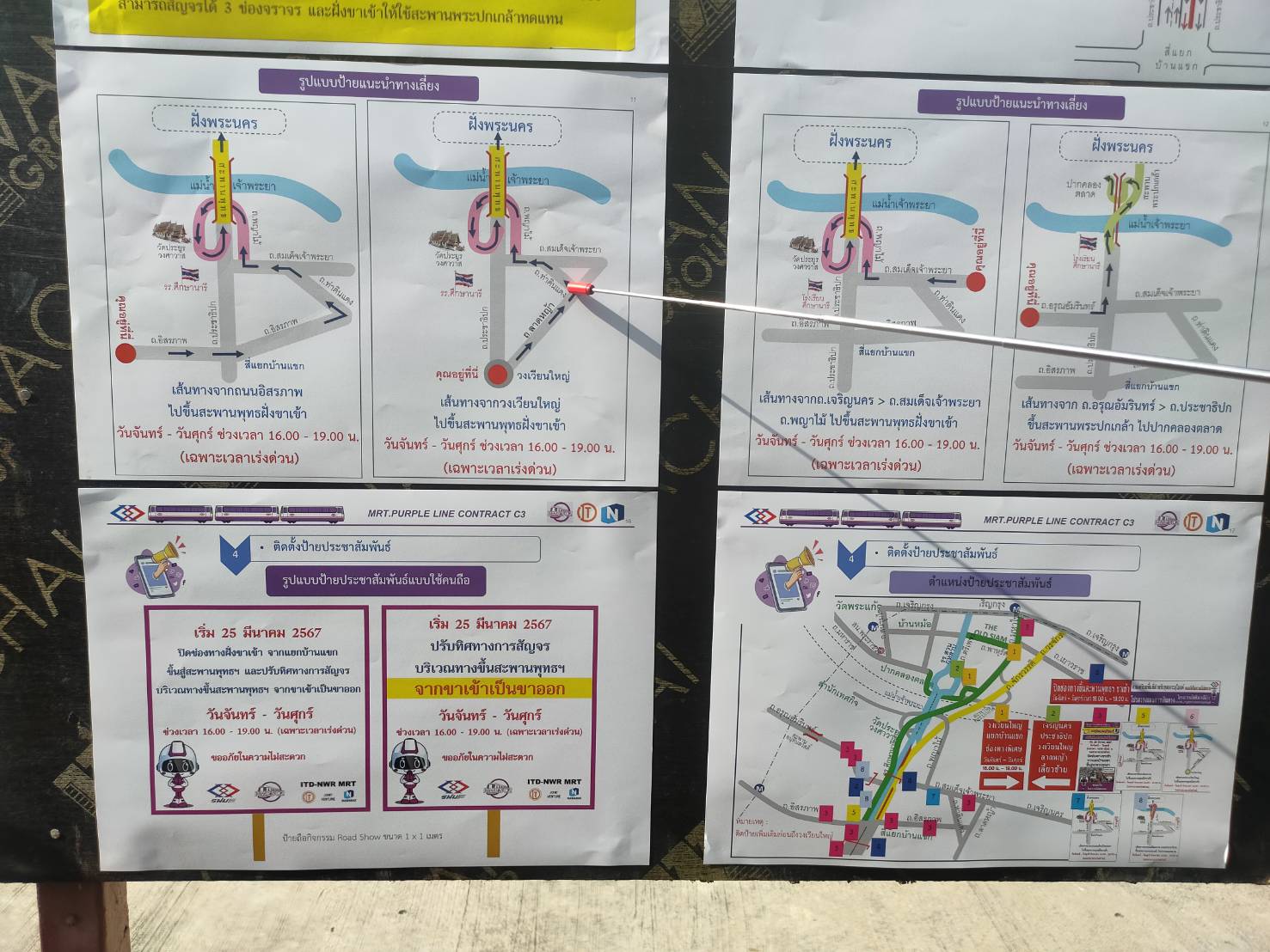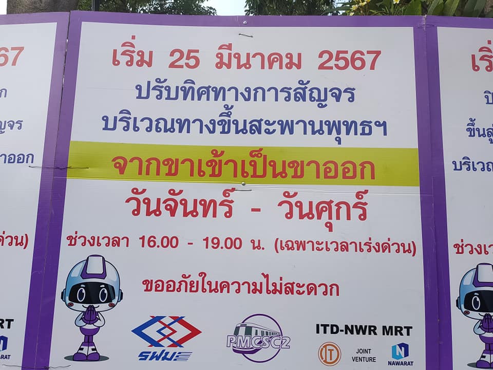 โดยตั้งแต่วันจันทร์ที่ 25 มีนาคม 2567 – วันพฤหัสบดีที่ 30 พฤษภาคม 2567 โครงการรถไฟฟ้าสายสีม่วงฯ จะดำเนินมาตรการปรับทิศทางการสัญจรบนถนนประชาธิปก และสะพานพระพุทธยอดฟ้า เฉพาะช่วงเวลาเร่งด่วน ทุกวันจันทร์ – วันศุกร์ ระหว่างเวลา 16.00 – 19.00 น. โดยปิดช่องทางจราจรบนถนนประชาธิปก ฝั่งขาเข้า จากสี่แยกบ้านแขก ขึ้นสู่สะพานพระพุทธยอดฟ้า เพื่อปรับทิศทางการสัญจรจากขาเข้าเป็นขาออก เพื่อให้รถที่มาจากบนสะพานพระพุทธยอดฟ้า ฝั่งขาออก ใช้เป็นช่องทางเฉพาะกิจลงสู่ถนนประชาธิปก ทดแทนการใช้ช่องทางจราจรร่วมกับรถที่มาจากสะพานพระปกเกล้า ฝั่งขาออก เพื่อเป็นการเพิ่มช่องจราจรฝั่งขาออกทั้งหมด จาก 2 ช่องจราจร เป็น 3 ช่องจราจร ช่วยระบายความหนาแน่นในช่วงเวลาเร่งด่วน สำหรับผู้ใช้เส้นทางในฝั่งขาเข้า ในช่วงเวลาเร่งด่วน ให้ใช้สะพานพระปกเกล้าทดแทน