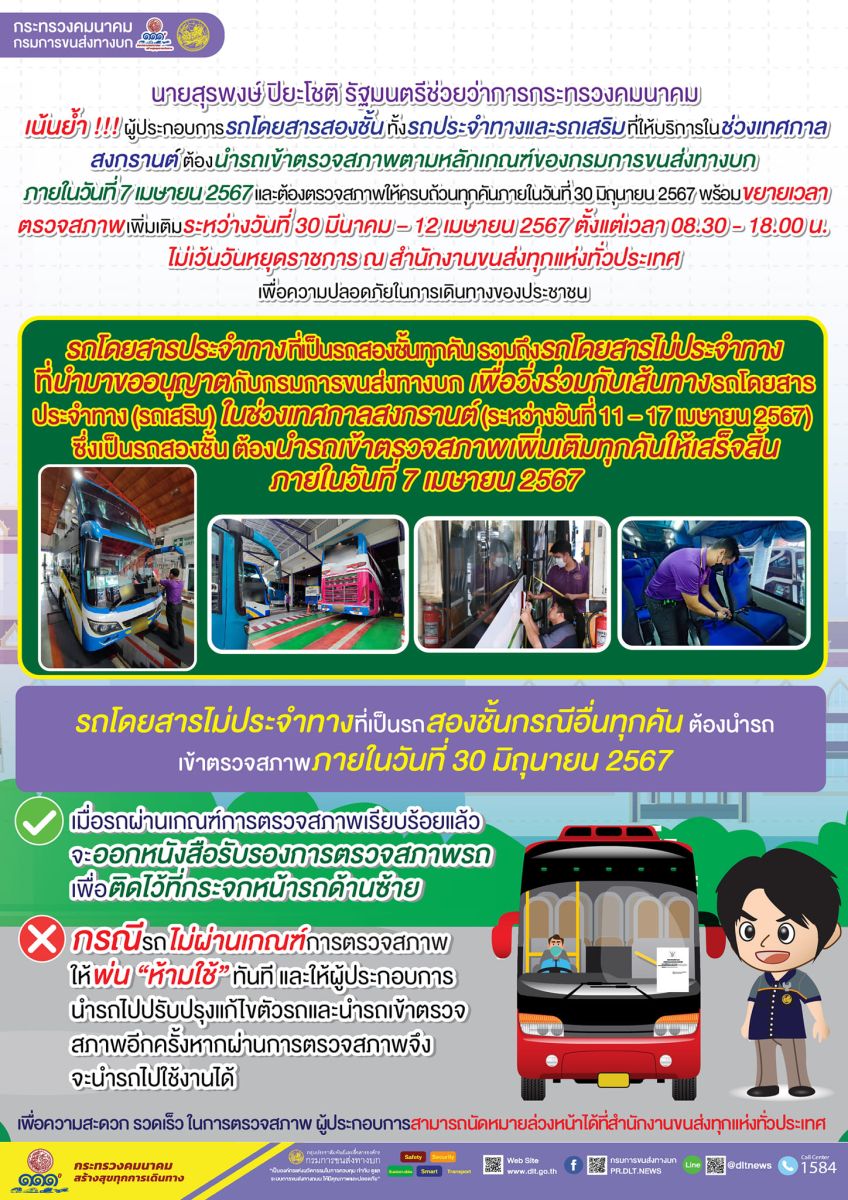 นายสุรพงษ์ ปิยะโชติ รัฐมนตรีช่วยว่าการกระทรวงคมนาคม เปิดเผยว่า เทศกาลสงกรานต์เป็นช่วงวันหยุดยาวที่ประชาชนนิยมเดินทางกลับภูมิลำเนาและมีนักท่องเที่ยวทั้งชาวไทยและชาวต่างชาติเดินทางไปพักผ่อนท่องเที่ยวตามสถานที่ต่าง ๆ ส่งผลให้มีการใช้รถใช้ถนนเป็นจำนวนมาก โดยในช่วงเทศกาลสงกรานต์ 2567 รัฐบาล นำโดยนายเศรษฐา ทวีสิน นายกรัฐมนตรี ได้มอบนโยบายให้กระทรวงคมนาคมดำเนินมาตรการอำนวยความสะดวกและความปลอดภัยของประชาชนเพื่อให้เดินทางถึงที่หมายได้อย่างปลอดภัยและลดการสูญเสียจากอุบัติเหตุในช่วง 7 วันอันตราย รวมถึงบูรณาการร่วมกับหน่วยงานที่เกี่ยวข้องเพื่อให้ประชาชนเดินทางได้อย่างไร้รอยต่อ ตอบโจทย์นโยบาย “สะดวก สบาย ปลอดภัย ไร้รอยต่อ” กระทรวงคมนาคมได้สั่งการไปยังกรมการขนส่งทางบกให้ดำเนินมาตรการตรวจความพร้อมของรถโดยสารและพนักงานให้มีความพร้อม 100 % ทั้งก่อนให้บริการและระหว่างเส้นทาง การเดินทางผ่านจุด Checking Point ทั่วประเทศ ทั้งนี้ รถโดยสารประจำทางและไม่ประจำทางเป็นรถที่ประชาชนนิยมใช้บริการในช่วงเทศกาลฯ โดยเฉพาะรถโดยสารสองชั้น ที่สามารถบรรทุกผู้โดยสารได้มากกว่ารถมาตรฐานอื่น เมื่อเกิดอุบัติเหตุขึ้นย่อมมีความเสี่ยงที่จะเกิดความเสียหายต่อชีวิตและทรัพย์สินจำนวนมาก เพื่อยกระดับความความปลอดภัยในการเดินทางด้วยรถโดยสารสองชั้น กรมการขนส่งทางบกได้ออกประกาศ เรื่อง กำหนดหลักเกณฑ์และวิธีการตรวจสภาพรถ ตามเงื่อนไขในใบอนุญาตประกอบการขนส่ง สำหรับรถที่ใช้ในการขนส่งผู้โดยสารมาตรฐาน 4 (รถสองชั้น) พ.ศ. 2567 เพื่อกำหนดให้รถโดยสารสองชั้นทุกคัน ต้องเข้ารับการตรวจสภาพเพิ่มเติมอย่างเข้มข้น เพื่อให้เกิดความปลอดภัยในการเดินทางของประชาชน ในช่วงเทศกาลสงกรานต์ ปี 2567 และขอกำชับ !!! ให้ผู้ประกอบการต้องนำรถโดยสารสองชั้น เข้ารับการตรวจสภาพเพิ่มเติมตามประกาศดังกล่าวอย่างเคร่งครัด เพื่อเป็นจุดเริ่มต้นของความปลอดภัยในการเดินทางของประชาชน