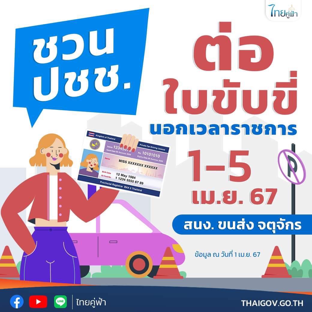 กรมการขนส่งทางบก กระทรวงคมนาคม จัดกิจกรรม “สัปดาห์ให้บริการประชาชน” ขยายเวลาการให้บริการประชาชนที่ต้องการเปลี่ยนประเภทใบอนุญาตขับรถส่วนบุคคลชั่วคราว (2 ปี เป็น 5 ปี) และต่ออายุใบอนุญาตขับรถส่วนบุคคล (5 ปี เป็น 5 ปี) ที่ยังไม่สิ้นอายุหรือขาดต่ออายุไม่เกิน 1 ปี และอบรม e –Learning หลักสูตร 1 ชั่วโมง มาแล้ว สามารถต่อใบอนุญาตขับรถ ระหว่างวันที่ 1 – 5 เม.ย. 67 ตั้งแต่เวลา 16.30 – 18.00 น. ณ อาคาร 4 ชั้น 1 สำนักงานขนส่งกรุงเทพมหานครพื้นที่ 5 (จตุจักร)