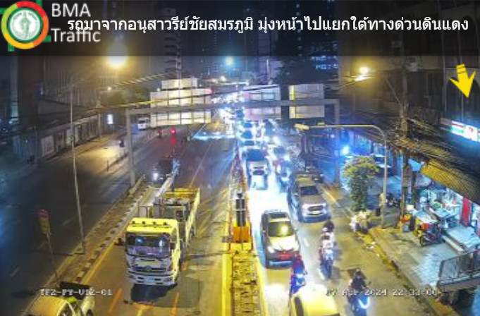 เวลา 22.30 น. วันที่ 7 เมษายน 2567 เจ้าหน้าที่กำลังปฏิบัติงาน ปิดสะพานข้ามแยกสามเหลี่ยมดินแดง เบี่ยงการจราจรใช้พื้นราบ ถนนดินแดง ฝั่งขาเข้ามุ่งหน้าอนุสาวรีย์ชัยสมรภูมิ ปริมาณรถมาก เคลื่อนตัวได้ตามสัญญาณไฟจราจรที่แยก