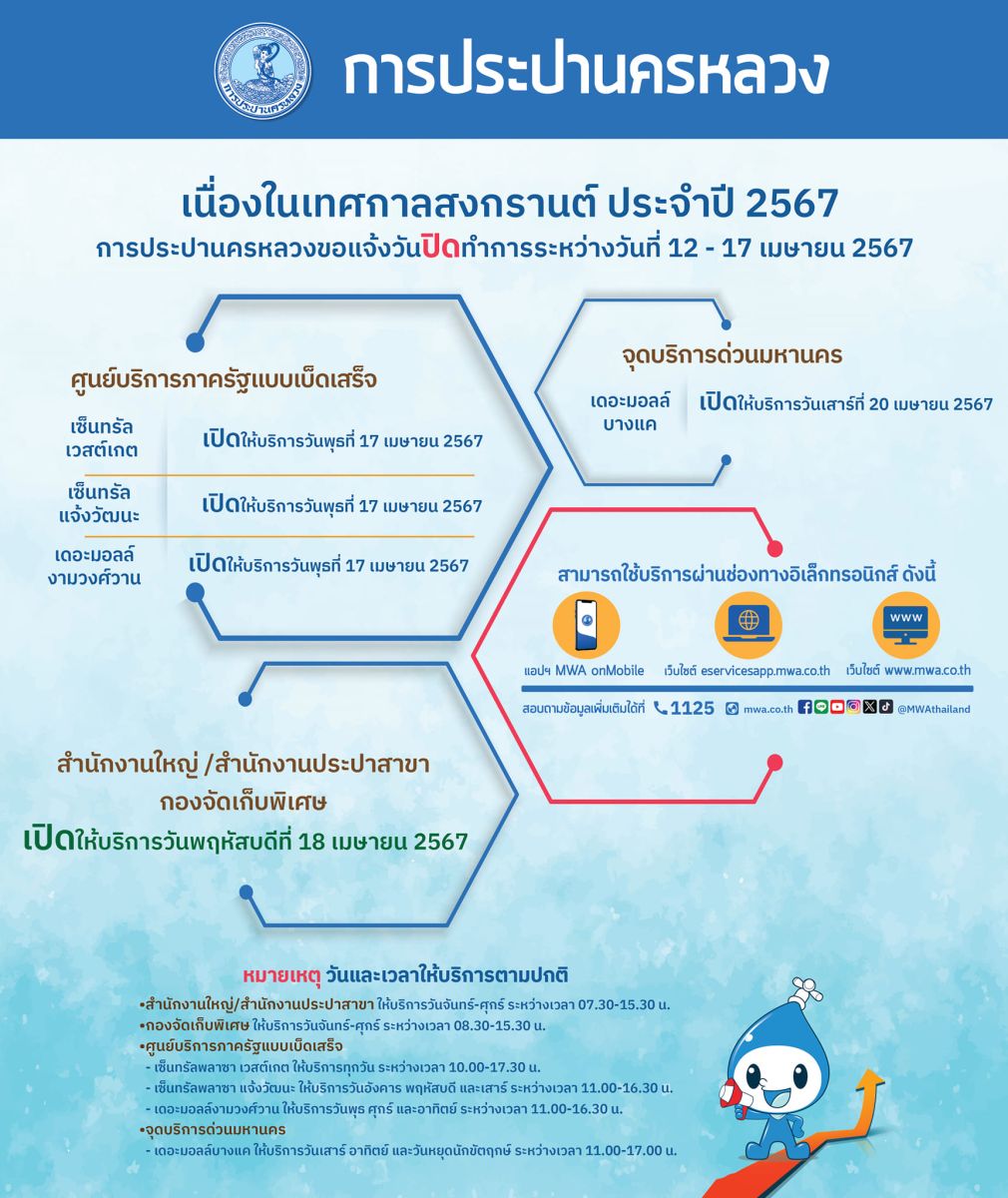 - สำนักงานใหญ่และสำนักงานประปาสาขาทุกแห่ง หยุดให้บริการวันที่ 12-17 เมษายน 2567