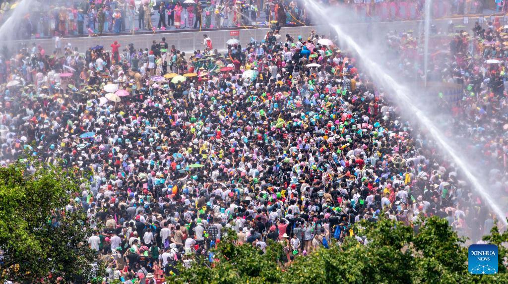 China Xinhua New เผยภาพบรรยากาศนักท่องเที่ยวและผู้คนท้องถิ่นหิ้วปืนฉีดน้ำและถังน้ำร่วมเล่นสนุกในเทศกาลสาดน้ำสุดคึกคัก จัดขึ้นบริเวณจัตุรัสในเมืองหมางซื่อ แคว้นปกครองตนเองเต๋อหง กลุ่มชาติพันธุ์ไทและจิ่งโพ มณฑลอวิ๋นหนาน (ยูนนาน) ทางตะวันตกเฉียงใต้ของจีน