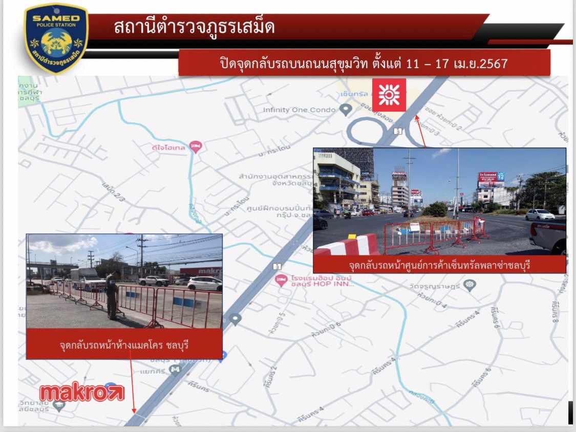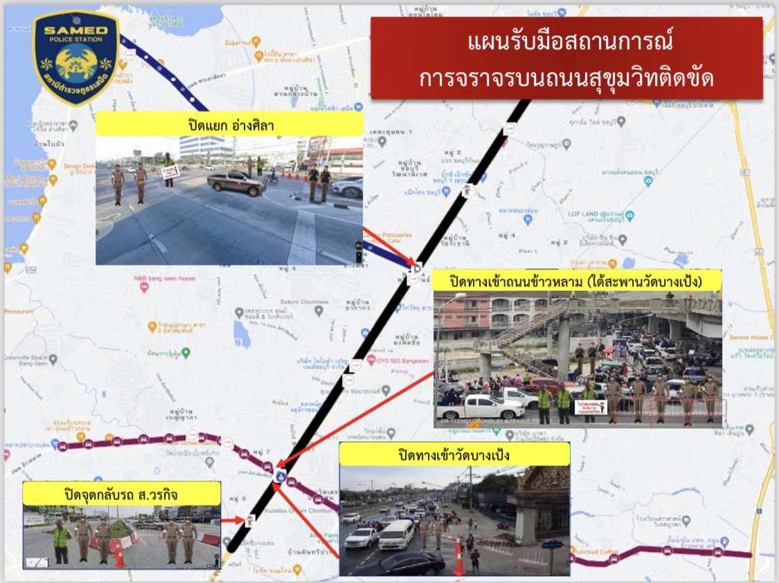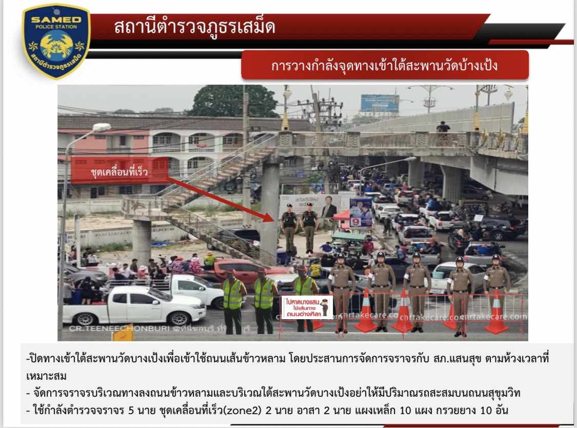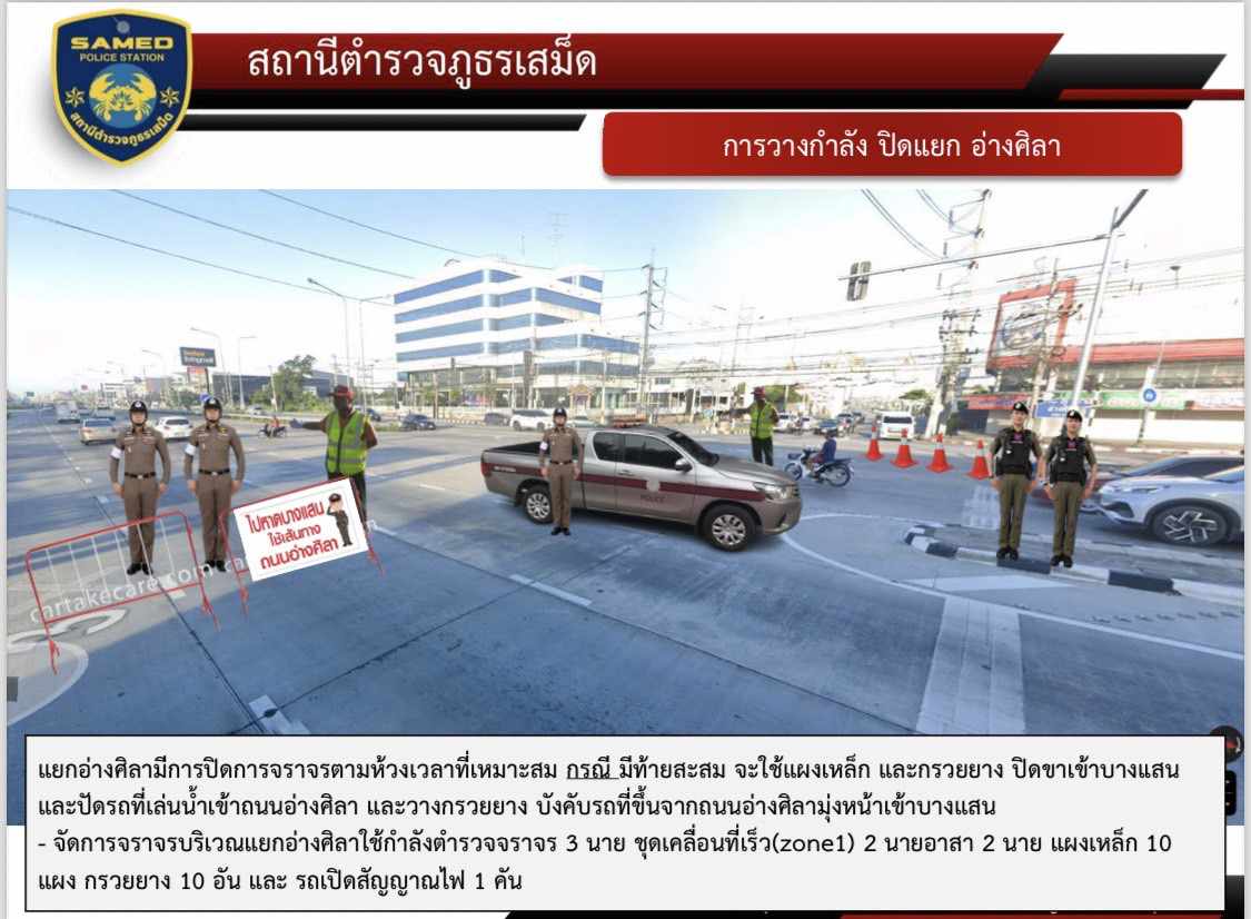 5. ถอดบทเรียนจากปี2566 แล้วออกแผนรับมือสถานการณ์การจราจรติดขัดบนถนนสุขุมวิท โดยมีจุดที่ต้องอำนวยการจราจรพิเศษ 4 จุด ใช้กำลังตำรวจจราจรของ สภ.ฯเต็มอัตรา(13 นายต่อวัน) และได้รับการสนับสนุนกำลังจราจร จาก ภ.จว.ฯ โดยคำสั่งของ ผบก.ภ.จว.ชลบุรี จำนวน 30 นายต่อวัน