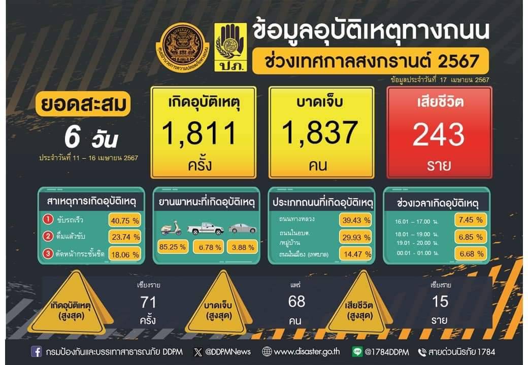 พล.ต.อ.เพิ่มพูน ชิดชอบ รัฐมนตรีว่าการกระทรวงศึกษาธิการ ในฐานะประธานแถลงผลการดำเนินงานของศูนย์อำนวยการป้องกันและลดอุบัติเหตุทางถนนช่วงเทศกาลสงกรานต์ พ.ศ. 2567 เปิดเผยว่า ศูนย์อำนวยการป้องกันและลดอุบัติเหตุทางถนนช่วงเทศกาลสงกรานต์ พ.ศ. 2567 โดยกรมป้องกันและบรรเทาสาธารณภัยและความร่วมมือของหน่วยงานภาคีเครือข่ายได้รวบรวมสถิติอุบัติเหตุทางถนนประจำวันที่ 16 เมษายน 2567 ซึ่งเป็นวันที่หกของการรณรงค์ “ขับขี่อย่างปลอดภัย เมืองไทยไร้อุบัติเหตุ” เกิดอุบัติเหตุ 242 ครั้ง ผู้บาดเจ็บ 237 คน ผู้เสียชีวิต 32 ราย สาเหตุที่ทำให้เกิดอุบัติเหตุสูงสุด ได้แก่ ขับรถเร็ว ร้อยละ 37.60 ดื่มแล้วขับ ร้อยละ 23.97 ตัดหน้ากระชั้นชิด ร้อยละ 21.07 ยานพาหนะที่เกิดอุบัติเหตุสูงสุด ได้แก่ รถจักรยานยนต์ ร้อยละ 84.90 ส่วนใหญ่เกิดบนเส้นทางตรง ร้อยละ 83.47 ถนนกรมทางหลวง ร้อยละ 41.32 ถนนใน อบต./หมู่บ้าน ร้อยละ 32.23 ช่วงเวลาที่เกิดอุบัติเหตุสูงสุด ได้แก่ เวลา 00.01 – 01.00 น. ร้อยละ 11.16 ผู้บาดเจ็บและเสียชีวิตสูงสุดอยู่ในช่วงอายุ 30-39 ปี ร้อยละ 20.07 จัดตั้งจุดตรวจหลัก 1,756 จุด เจ้าหน้าที่ปฏิบัติงาน 51,331 คน โดยจังหวัดที่เกิดอุบัติเหตุสูงสุด ได้แก่ แพร่ (13 ครั้ง) จังหวัดที่มีผู้บาดเจ็บสูงสุด ได้แก่ แพร่ (18 คน) จังหวัดที่มีผู้เสียชีวิตสูงสุด ได้แก่ ขอนแก่นและสุรินทร์ (จังหวัดละ 3 ราย) สรุปอุบัติเหตุทางถนนสะสมในช่วง 6 วันของการรณรงค์ (11 – 16 เม.ย. 67) เกิดอุบัติเหตุรวม 1,811 ครั้ง ผู้บาดเจ็บรวม 1,837 คน ผู้เสียชีวิต รวม 243 ราย จังหวัดที่ไม่มีผู้เสียชีวิต (ตายเป็นศูนย์) มี 9 จังหวัด จังหวัดที่เกิดอุบัติเหตุสะสมสูงสุด ได้แก่ เชียงราย (71 ครั้ง) จังหวัดที่มีผู้บาดเจ็บสะสมสูงสุด ได้แก่ แพร่ (68 คน) จังหวัดที่มีผู้เสียชีวิตสะสมสูงสุด ได้แก่ เชียงราย (15 ราย)