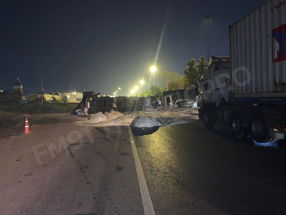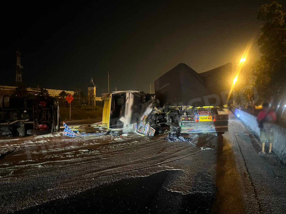 'ยักษ์ชนยักษ์' แล้วล้มขวางถนนสายเอเชีย ฝั่งขาเข้า กทม. หลัก กม.ที่ 11 การจราจรเป็นอัมพาต จนท.เร่งเคลื่อนย้าย