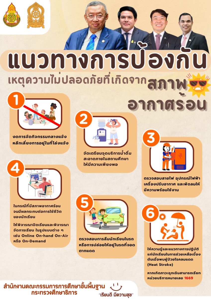 "ด้วยสถานการณ์ดังกล่าวอาจกระทบต่อสุขภาพของนักเรียน ครูและบุคลากรทางการศึกษา ตามข้อห่วงใยของ พล.ต.อ.เพิ่มพูน ชิดชอบ รมว.ศธ. และนายสุรศักดิ์ พันธ์เจริญวรกุล รมช.ศธ. จึงได้เน้นย้ำให้ความรู้ที่ถูกต้องในการป้องกัน และขอความร่วมมือนักเรียน ครูและบุคลากรทางการศึกษาทุกท่าน สังเกตอาการตนเองและบุคคลรอบข้าง หากมีอาการโรคลมแดด (Heat Stroke) ให้รีบแจ้งเหตุโดยทันที เพื่อที่เจ้าหน้าที่ผู้เชี่ยวชาญจะได้ดำเนินการเข้าช่วยเหลืออย่างเร่งด่วนต่อไป ด้วยความห่วงใยจากกระทรวงศึกษาธิการ และ สพฐ." เลขาธิการ กพฐ. กล่าว
