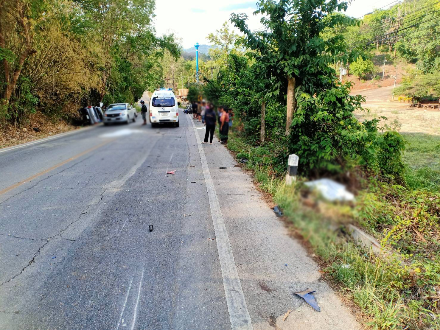 ชายขี่รถ จยย. อาสาพาเด็กป่วยไปหาหมอ มีหญิงนั่งซ้อนท้าย เกิดอุบัติเหตุชนกับรถกระบะ ทำให้เสียชีวิตทั้ง 3 ราย จ.กาญจนบุรี