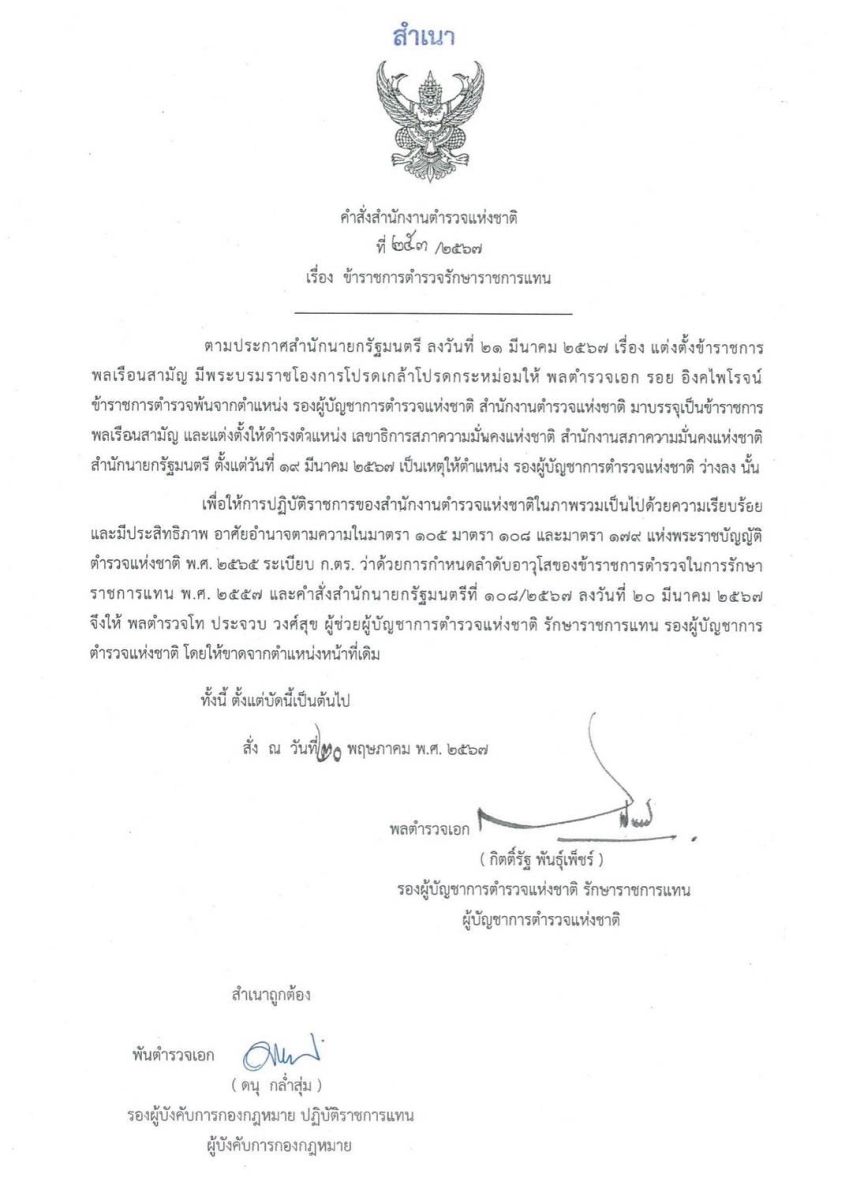 ระบุ ตามประกาศสำนักนายกรัฐมนตรี ลงวันที่ 21 มีนาคม 2567 เรื่อง แต่งตั้งข้าราชการ พลเรือนสามัญ มีพระบรมราชโองการโปรดเกล้าโปรดกระหม่อมให้ พล.ต.อ.รอย อิงคไพโรจน์ ข้าราชการตำรวจพ้นจากตำแหน่ง รองผู้บัญชาการตำรวจแห่งชาติ สำนักงานตำรวจแห่งชาติ มาบรรจุเป็นข้าราชการ พลเรือนสามัญ และแต่งตั้งให้ดำรงตำแหน่ง เลขาธิการสภาความมั่นคงแห่งชาติ สำนักงานสภาความมั่นคงแห่งชาติ สำนักนายกรัฐมนตรี ตั้งแต่วันที่ 19 มีนาคม 2567 เป็นเหตุให้ตำแหน่ง รองผู้บัญชาการตำรวจแห่งชาติ ว่างลง เพื่อให้การปฏิบัติราชการของสำนักงานตำรวจแห่งชาติในภาพรวมเป็นไปด้วยความเรียบร้อย และมีประสิทธิภาพ อาศัยอำนาจตามความในมาตรา 105 มาตรา 108 และมาตรา 179 แห่งพระราชบัญญัติ ตำรวจแห่งชาติ พ.ศ. 2565 ระเบียบ ก.ตร. ว่าด้วยการกำหนดลำดับอาวุโสของข้าราชการตำรวจในการรักษาราชการแทน พ.ศ. 2557 และคำสั่งสำนักนายกรัฐมนตรีที่ 118/2567 ลงวันที่ 20 มีนาคม 2567