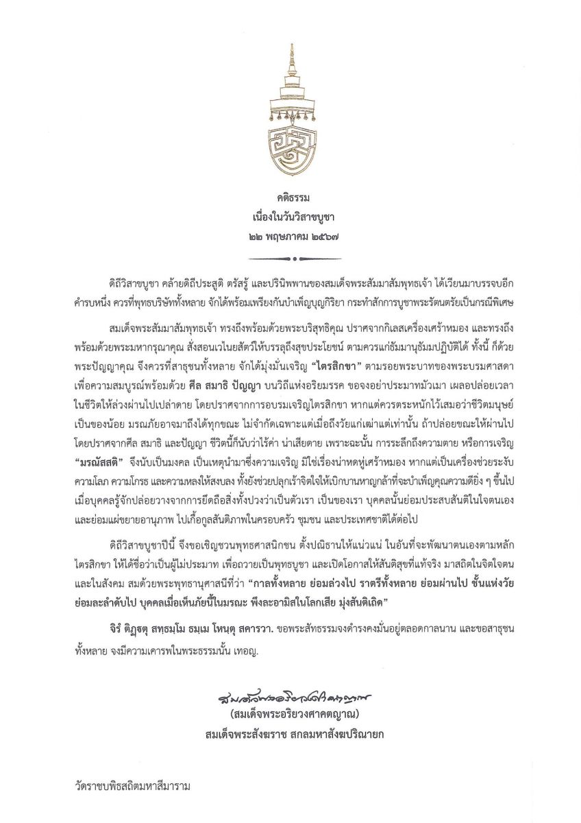 เนื่องในดิถีวิสาขบูชา วันพุธ ที่ ๒๒ พฤษภาคม ๒๕๖๗ เจ้าพระคุณ สมเด็จพระอริยวงศาคตญาณ สมเด็จพระสังฆราช สกลมหาสังฆปริณายก ประทานพระคติธรรม ความว่า