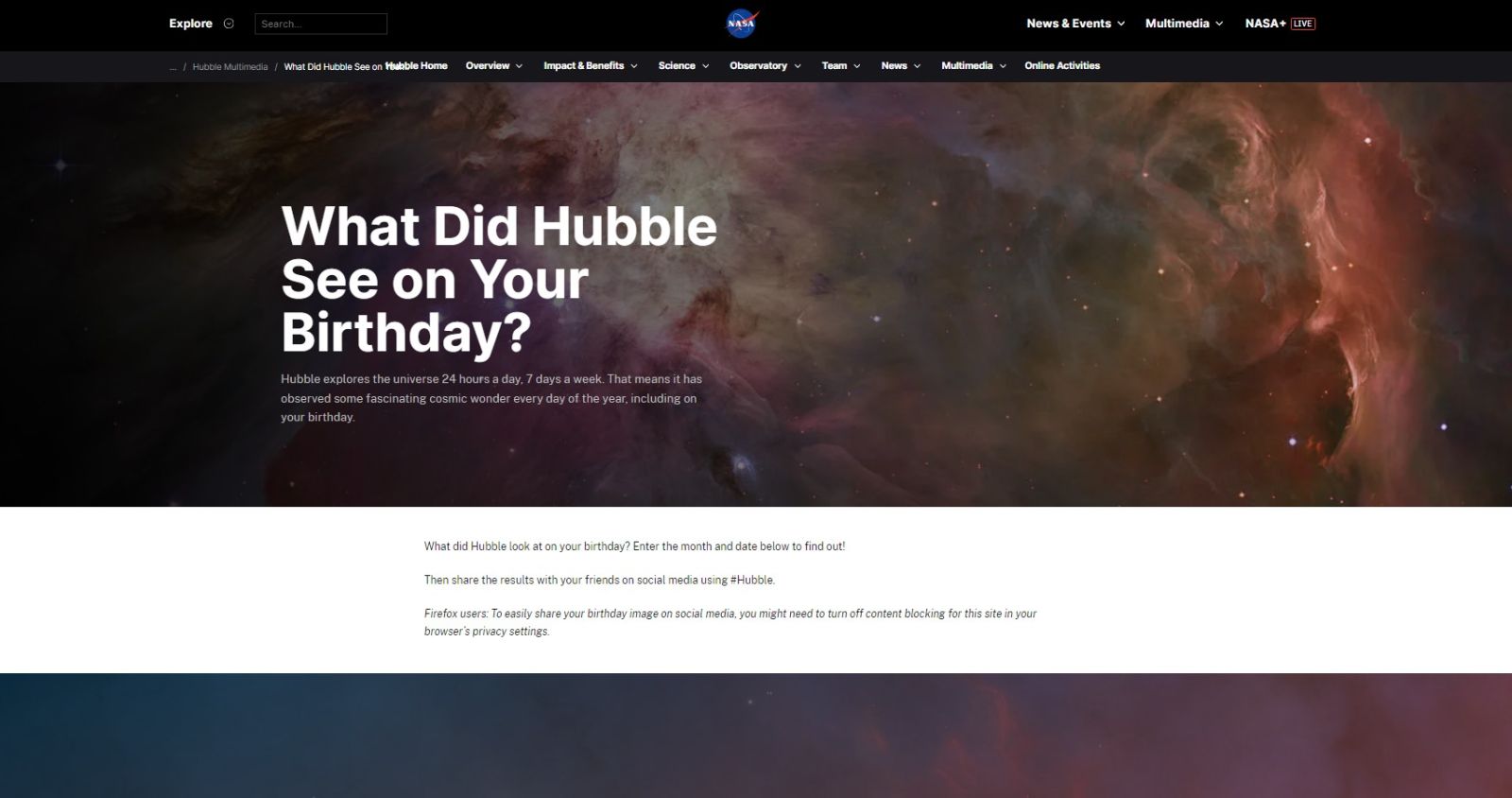 โดยเว็บไซต์ของ NASA ได้เปิดให้ทุกคนสามารถรับชมภาพจากกล้องฮับเบิลที่ถ่ายได้ในวันเกิดของคุณว่าเป็นภาพ หรือวัตถุอวกาศแบบไหน
