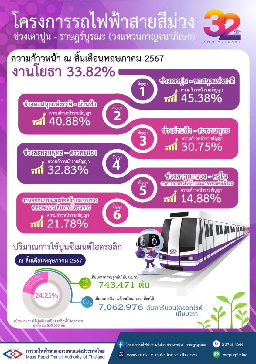 รฟม. อัพเดทความคืบหน้าการก่อสร้างโครงการรถไฟฟ้าสายสีชมพู ส่วนต่อขยาย และ โครงการรถไฟฟ้าสายสีม่วง ช่วงเตาปูน - ราษฎร์บูรณะ (วงแหวนกาญจนาภิเษก) ณ สิ้นเดือนพฤษภาคม 2567