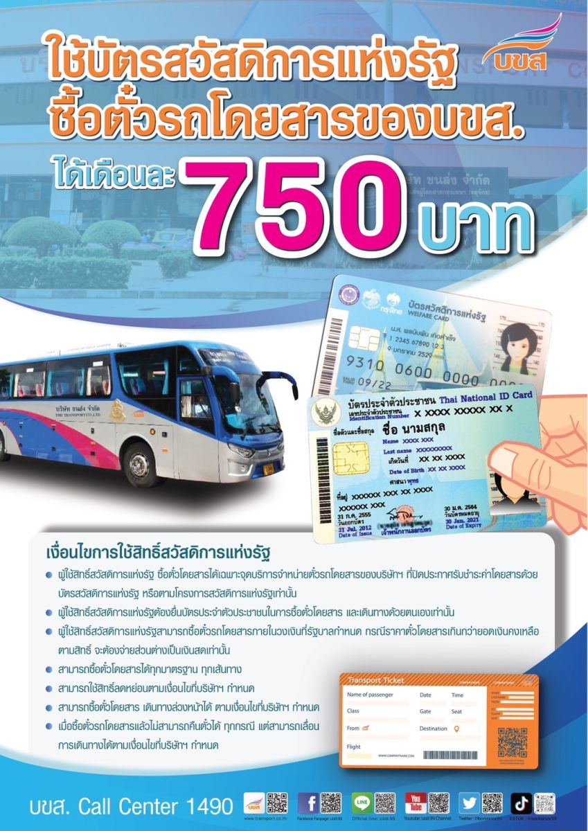 นายอรรถวิท รักจำรูญ กรรมการฯ รักษาการแทนกรรมการผู้จัดการใหญ่ บริษัท ขนส่ง จำกัด (บขส.) เปิดเผยว่า เพื่ออำนวยความสะดวกประชาชนในการใช้บริการรถโดยสารของ บขส. ตามสิทธิ์ต่างๆ ที่ประชาชนมี และสามารถใช้สิทธิ์ซื้อตั๋วโดยสารของบริษัทฯ ได้นั้น บขส. จึงขอย้ำว่า ปัจจุบันผู้โดยสารสามารถใช้บัตรสวัสดิการแห่งรัฐ ตามโครงการของรัฐบาลที่ให้ประชาชนสามารถจ่ายค่าเดินทางผ่านระบบขนส่งสาธารณะ 750 บาทต่อคนต่อเดือน โดยประชาชนสามารถนำบัตรสวัสดิการแห่งรัฐซื้อตั๋วโดยสารได้ที่ช่องจำหน่ายตั๋วของ บขส. ทั่วประเทศ