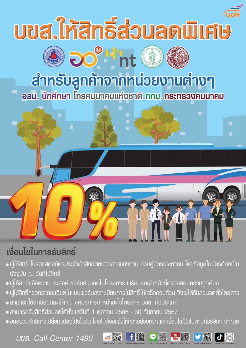 โดยมีเงื่อนไขการรับสิทธิ์ ดังนี้ 1.ผู้ใช้สิทธิ์ โปรดแสดงบัตรประจำตัวสังกัดหน่วยงานของท่านควบคู่บัตรประชาชน โดยข้อมูลในบัตรต้องเป็นปัจจุบัน ณ วันที่ใช้สิทธิ์ 2.ผู้ใช้สิทธิ์แจ้งความประสงค์ ขอรับส่วนลดในโครงการ พร้อมรอเจ้าหน้าที่ตรวจสอบความถูกต้อง 3.สามารถใช้สิทธิ์ส่วนลดได้ ณ จุดบริการจำหน่ายตั๋วโดยสาร บขส. ทั่วประเทศ 4.โดยสามารถรับสิทธิ์ส่วนลดได้ ตั้งแต่วันนี้ - 30 ก.ย. 2567 ทุกเส้นทางภายในประเทศ และ 5.ขอสงวนสิทธิ์การเปลี่ยนแปลงโปรโมชัน โดยไม่ต้องแจ้งให้ทราบล่วงหน้า และเงื่อนไขเป็นไปตามที่บริษัทฯ กำหนด สอบถามข้อมูลเพิ่มเติมที่งานการตลาดและลูกค้าสัมพันธ์ โทร. 0 - 2537 - 8737 หรือ โทร. บขส. Call Center 1490 ตลอด 24 ชั่วโมง