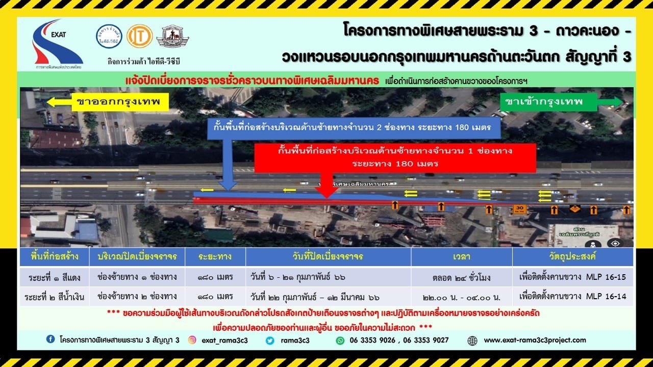 กทพ. ต้องขออภัยในความไม่สะดวกมา ณ โอกาสนี้ และขอความร่วมมือผู้ที่ใช้เส้นทางบริเวณดังกล่าวโปรดสังเกตป้ายเตือน สัญญาณจราจรต่าง ๆ และปฏิบัติตามเครื่องหมายจราจรอย่างเคร่งครัด เพื่อความปลอดภัยของผู้ใช้ทาง และขออภัยในความไม่สะดวกมา ณ โอกาสนี้หากมีข้อเสนอแนะ สามารถติดต่อสอบถามได้ที่ 02-405-4896 ตั้งแต่ 08.00-19.00 และ 062-912-6211 ตลอด 24 ชั่วโมง