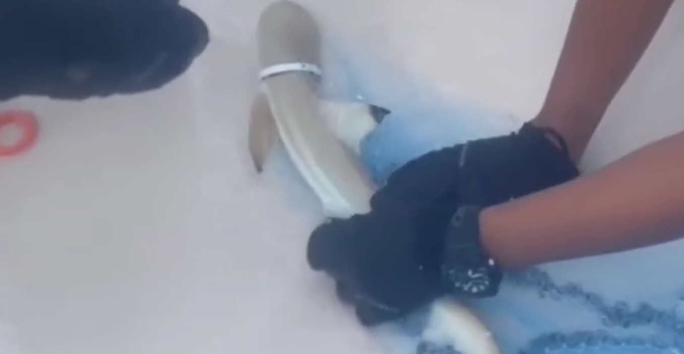 ลูกฉลามครีบดำถูกพลาสติกรัดครีบและปิดทับช่องเหงือก เจ้าหน้าที่เข้าช่วยเหลือ รอดตายหวุดหวิด