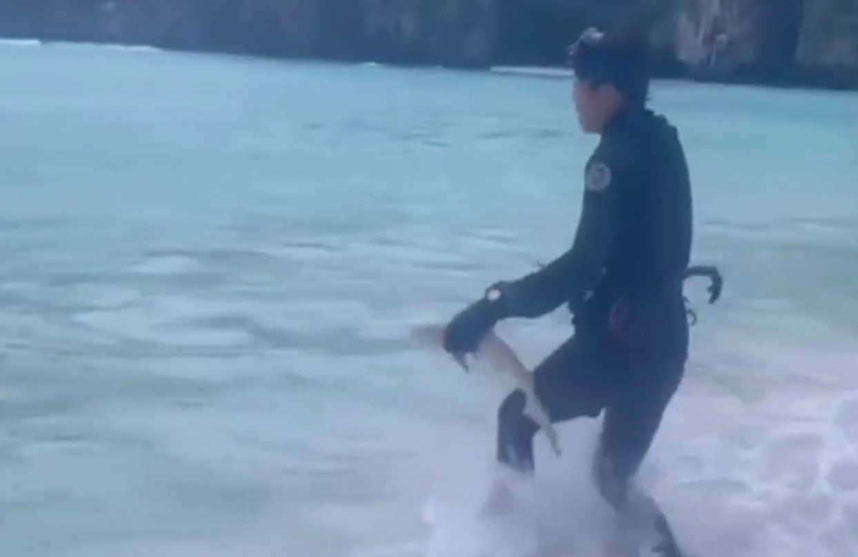 วันที่ 26 มิถุนายน นายวิชญุตร์ ลิมังกูร บุณยเนตร ที่ปรึกษา อธิบดีกรมทรัพยากรทางทะเลและชายฝั่ง (ทช.) โพสต์เฟซบุ๊ก ระหว่างการช่วยเหลือลูกฉลามครีบดำ ที่อ่าวมาหยา อุทยานแห่งชาติหาดนพรัตน์ธารา-หมู่เกาะพีพี จ.กระบี่