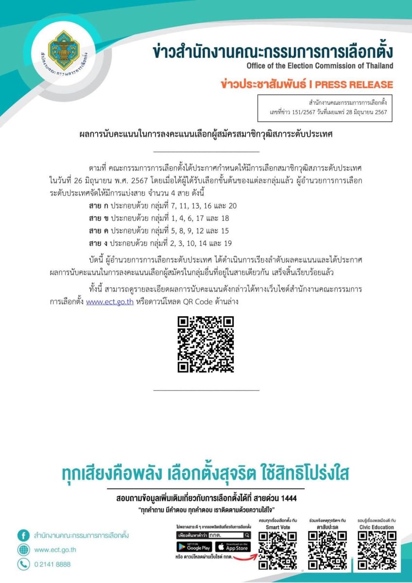ขณะนี้ผู้อำนวยการการเลือกระดับประเทศ ได้ดำเนินการเรียงลำดับผลคะแนนและได้ประกาศ ผลการนับคะแนนในการลงคะแนนเลือกผู้สมัครในกลุ่มอื่นที่อยู่ในสายเดียวกัน เสร็จสิ้นเรียบร้อยแล้ว สามารถดูรายละเอียดผลการนับคะแนนดังกล่าวได้ทางเว็บไซต์สำนักงานคณะกรรมการ การเลือกตั้ง www.ect.go.th.